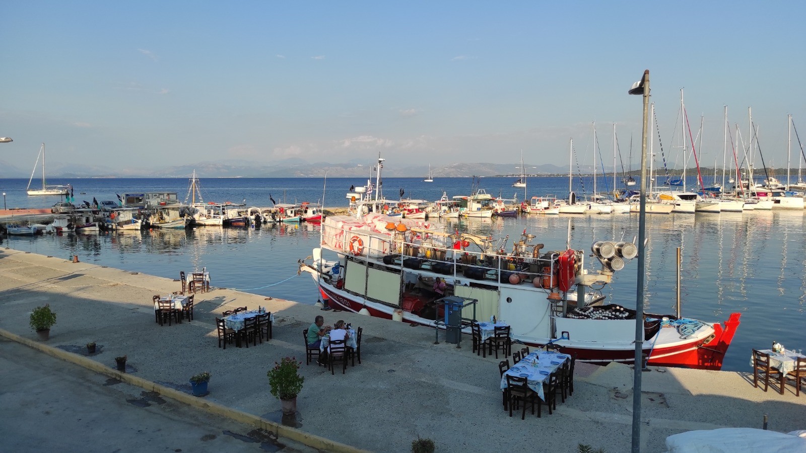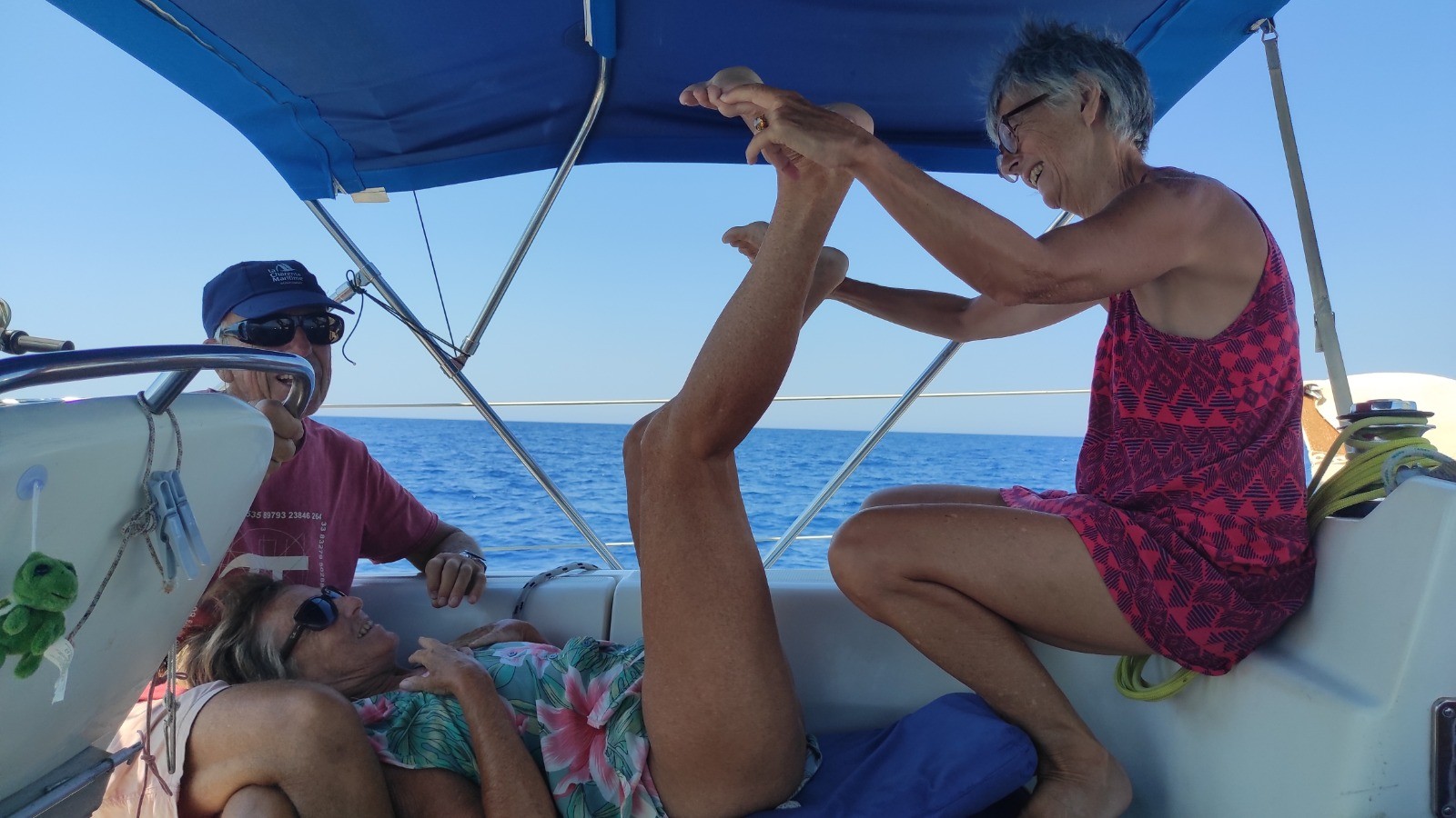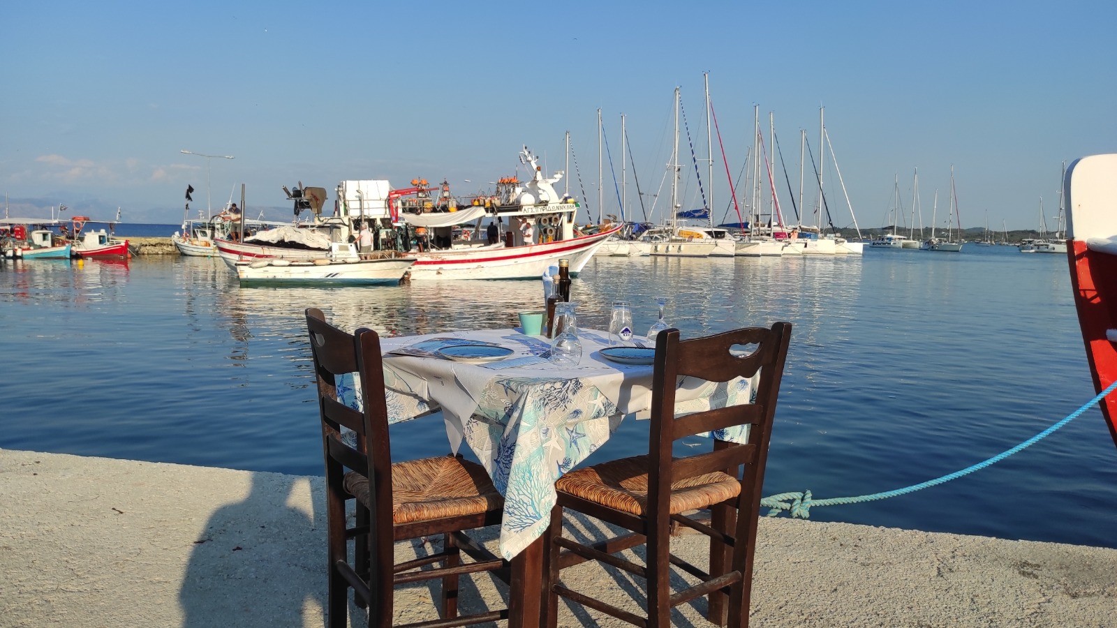 Gaios en bateau, puis sous voile pour Corfou. Bon vent, speedo en panne, taverne chez Vasili, les bateaux de pêche, les lunettes de Bernard à l'eau, Maryvonne encore une fois héroïque.
