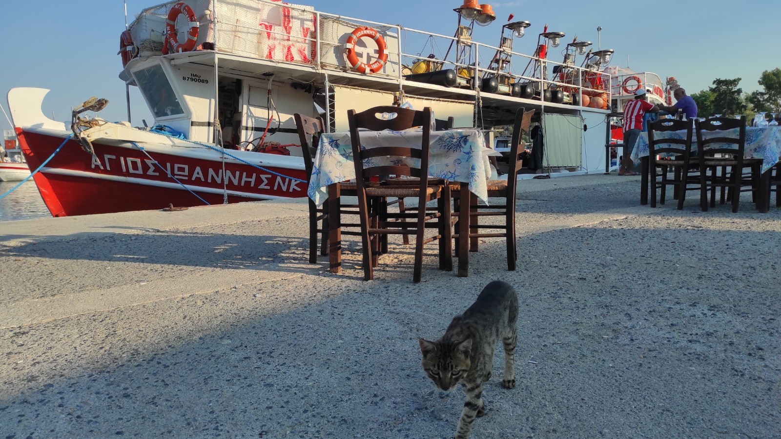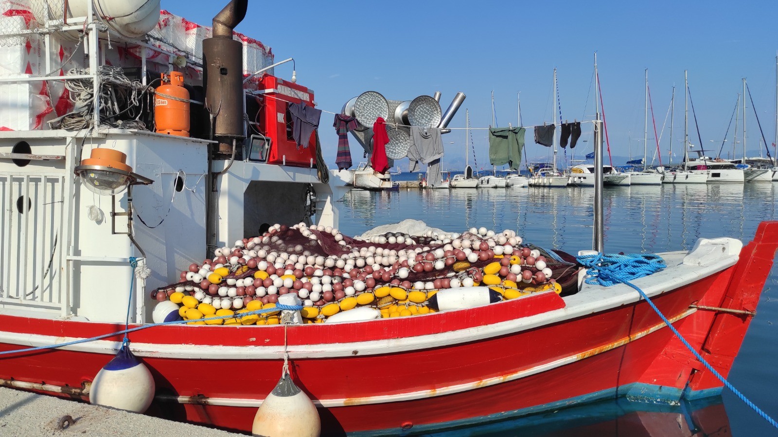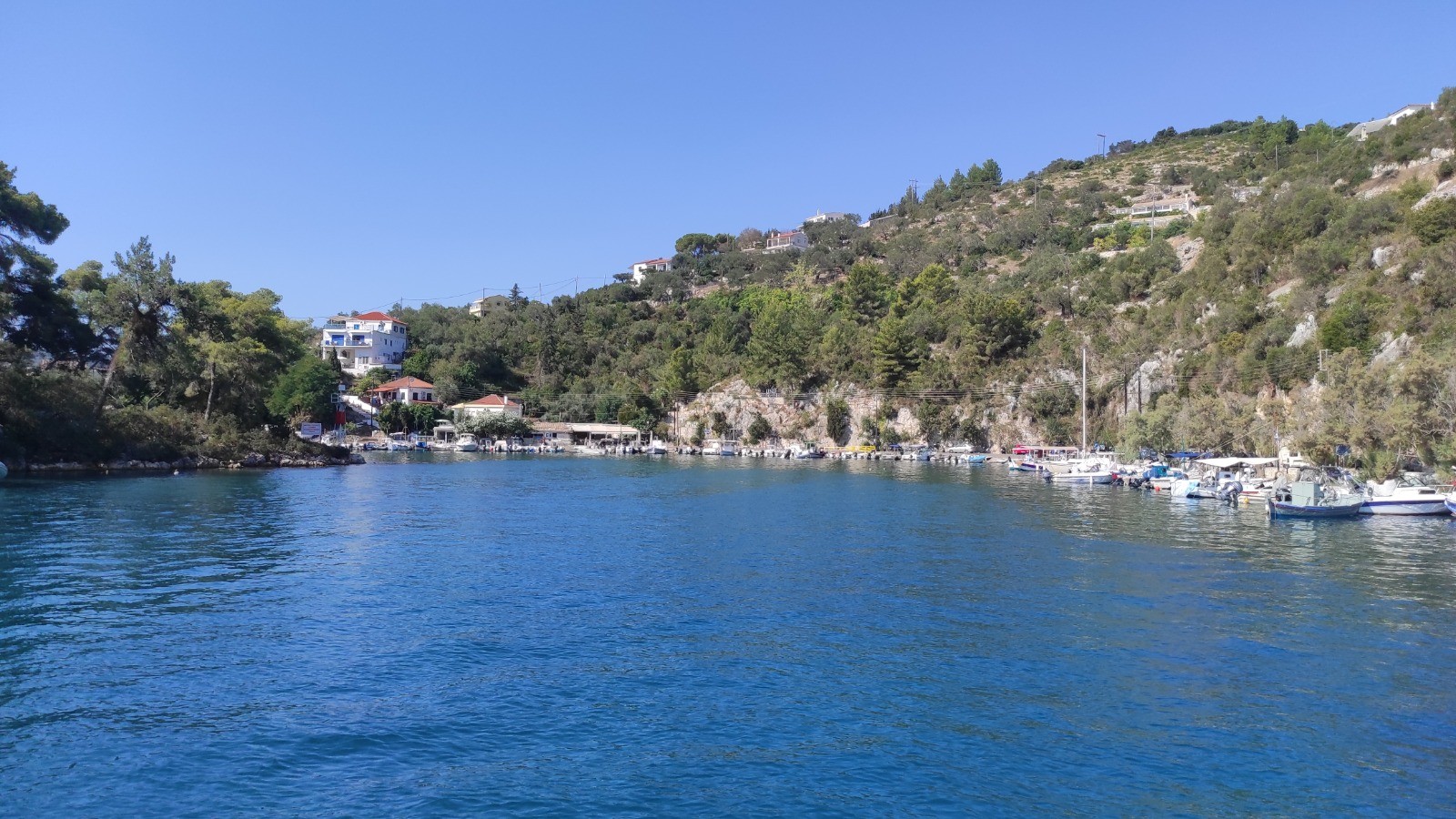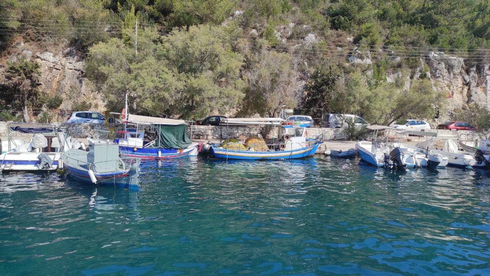 Gaios en bateau, puis sous voile pour Corfou. Bon vent, speedo en panne, taverne chez Vasili, les bateaux de pêche, les lunettes de Bernard à l'eau, Maryvonne encore une fois héroïque.