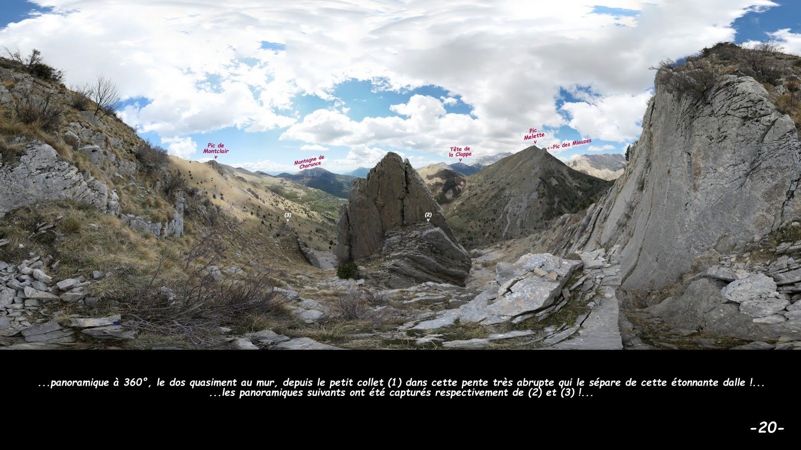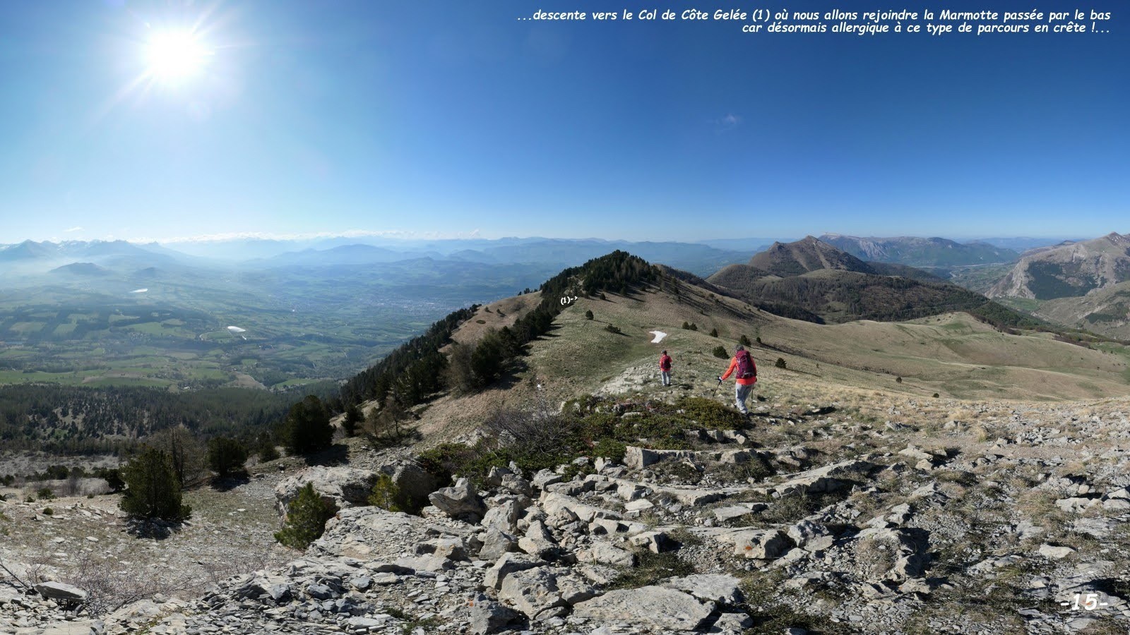 "attention danger passage délicat !", signalement légitime et nécessaire pour les randonneurs peu entraînés, cependant l'itinéraire est sans souci jusqu'au sommet du Pic, ensuite la traversée jusqu'à la cote 1926m par une arête rocheuse, relativement effilée et aérienne (en pointillés rouges sur Géoportail et la carte Top 25 de l'IGN) où la prudence s'impose n'est pas à prendre à la légère, cependant elle reste techniquement très facile si l'on suit rigoureusement le balisage qui permet d'éviter les quelques passages les plus exposés, reste que pour les plus véloces et bien rodés à ce type d'exercice, rester sur le fil est un véritable plaisir du genre, sans jamais oublier que malgré les apparences le rocher n'y est pas toujours très franc, prudence > descendre facilement jusqu'au Col de Côte Gelée, 1862m > passer en traversée la bosse boisée suivante > rester en crête encore sur une trentaine de m de dénivelé avant de tirer franchement à droite pour rejoindre plus directement que nous la tranquille bosse herbeuse cotée 1687m > suivre au Nord la sente à vaches de son talweg > le quitter pour poursuivre quasi horizontalement, toujours par une bonne sente qui conduit à la source de la cote 1610m, et rejoindre l'excellent sentier balisé du Col de Gleize > le suivre jusqu'à la cote 1651m où déjà phagocyté par une draine il s'en détache une deuxième sur la gauche, la suivre sur toute sa longueur (elle en traverse une autre encore plus large qui occupe le fond du talweg et remonte en rive droite pour se terminer une centaine de m plus loin > continuer dès le talus surmonté, une sente la poursuit et traverse le talweg suivant (qu'il est facile de remonter jusqu'au Col du Milieu, trace de la Marmotte !) > monter au mieux au Pic de Montclair, soit droit dans la pente en limite de la forêt, soit par exemple en suivant notre trace, si l'on souhaite passer ce Pic en traversée, où il faut un peu s'aider des mains pour sortir en crête nettement sous le sommet, techniquement facile et relativement peu exposé ! > beau panorama au sommet d'où un très court passage rocheux permet de rejoindre, sans avoir besoin des mains, la crête herbeuse > passer la bosse suivante et rejoindre le Pic de Courmian, 1855m > pour son panorama sur tout le vallon source du Torrent de la Rivière du Col de Chabanottes au Col du Milieu effectuer au moins l'aller-retour jusqu'au bout de la crête et, si le coeur vous en dit, pourquoi pas une visite au plus près de cette fameuse dalle fétiche de l'Ours sachant quand même que c'est alors beaucoup plus exposé > retour à l'Est du Pic de Courmian pour descendre dans le mélézin en ligne directe jusqu'au Col du Milieu > retour parking par la Route de Chaudun.