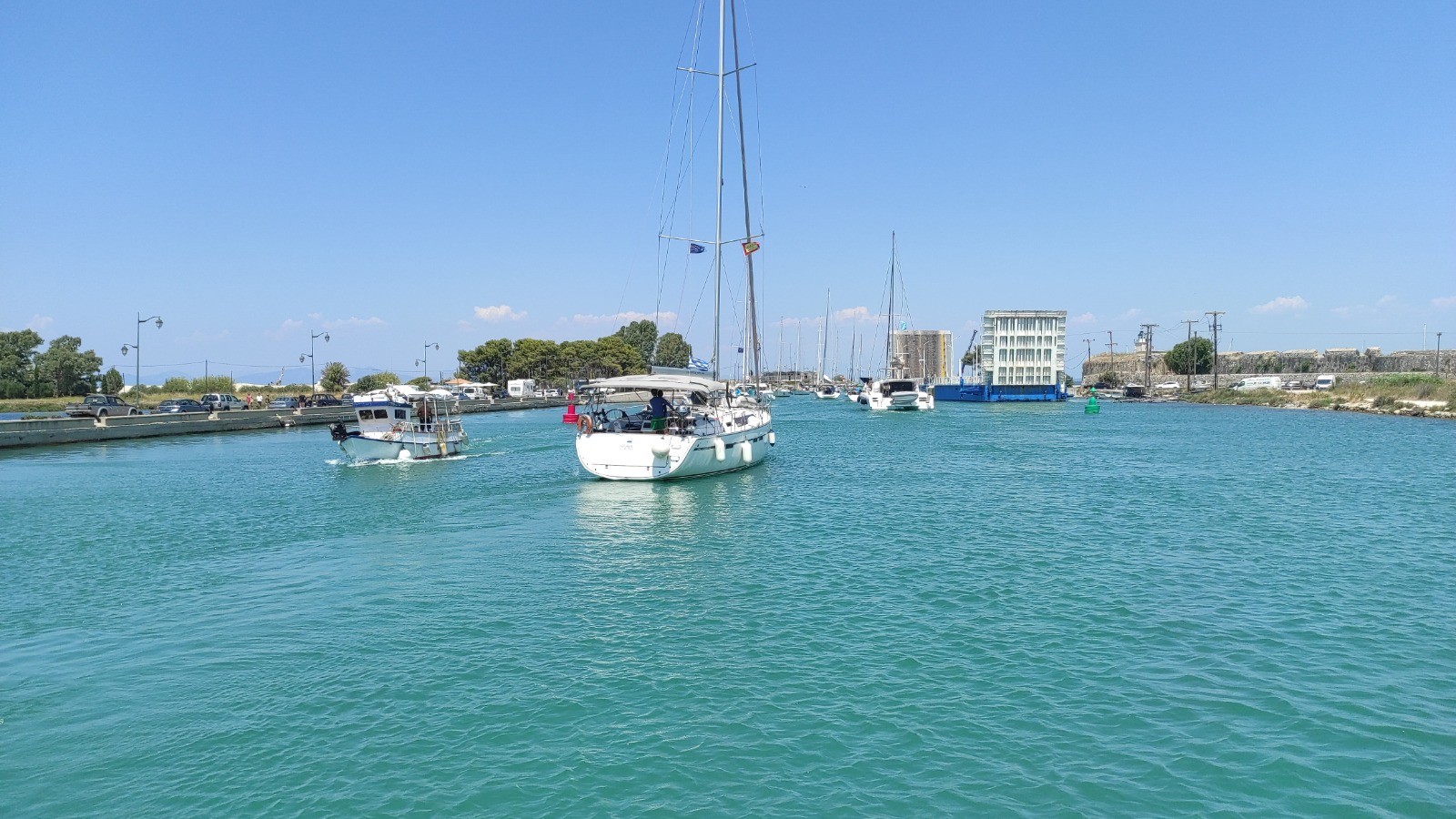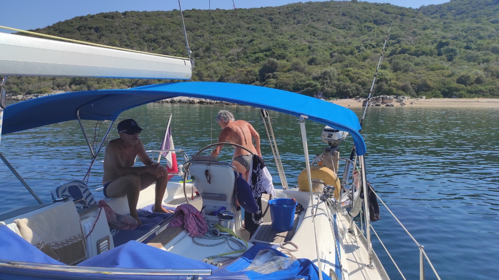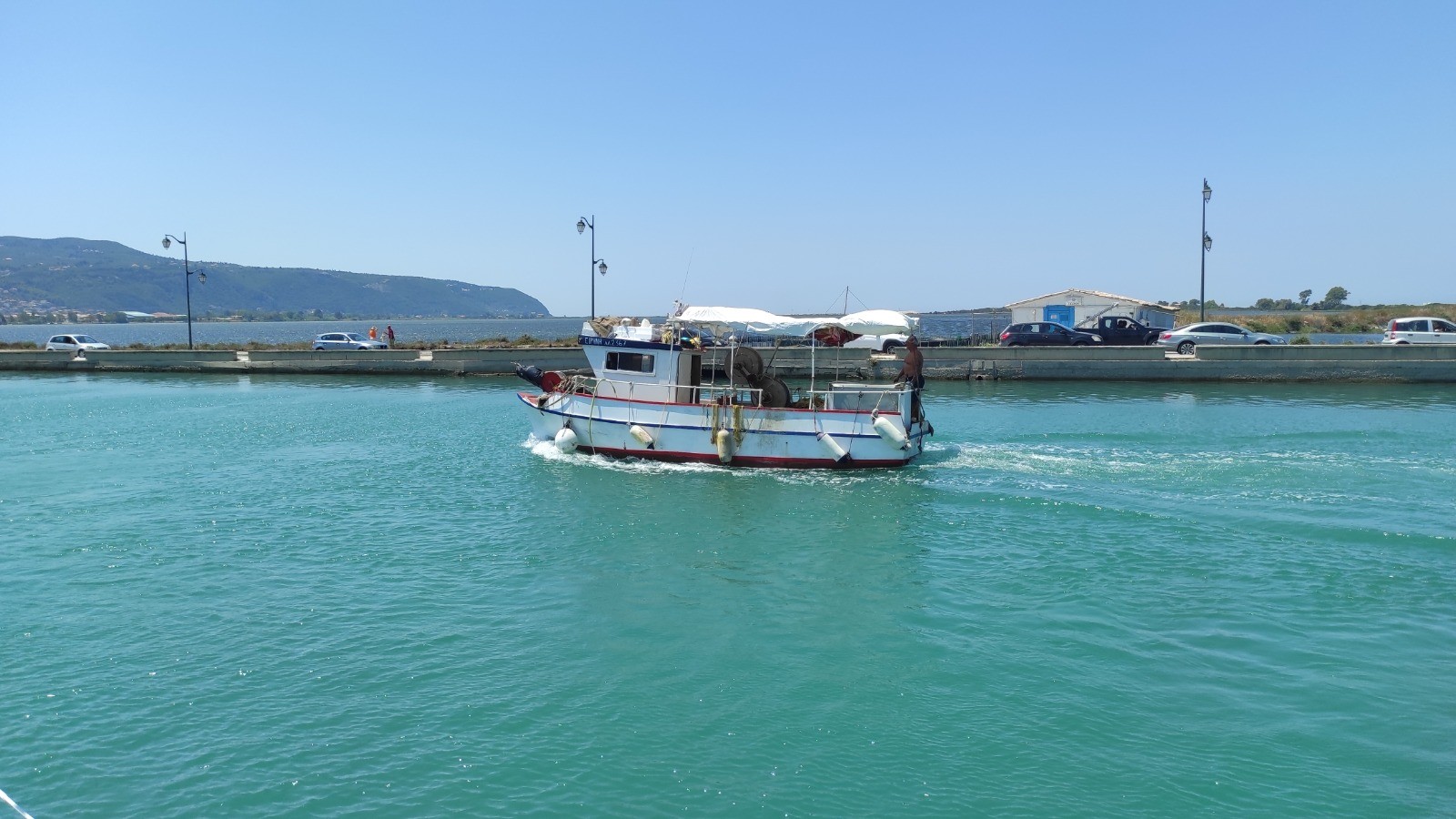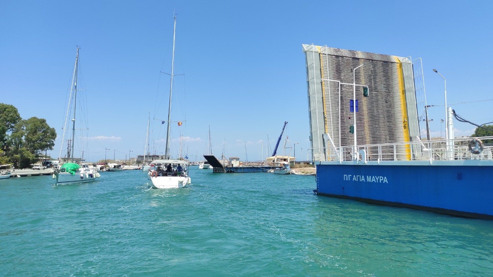 Départ pour un long trajet qui emprunte la canal de Lefkada et son pont tournant. Avant, mouillage, baignade près d'une petite plage déserte avec un chaise. Trop long l'arrêt, du coup on rate l'ouverture de midi du pont. Celle de 13hr n'aura pas lieu, on fera des ronds dans l'eau pour attendre celle de 14hr.