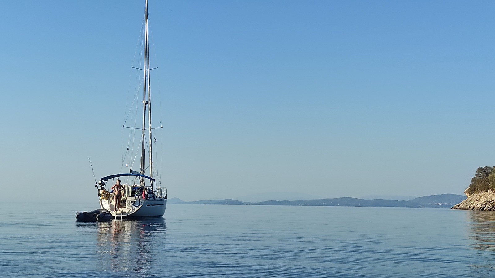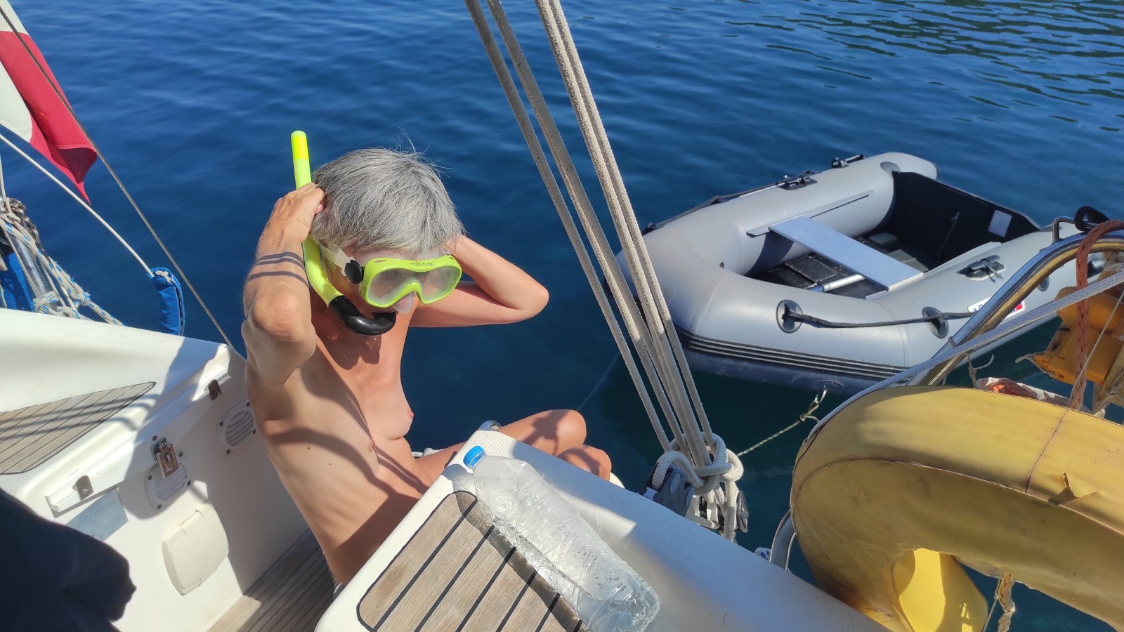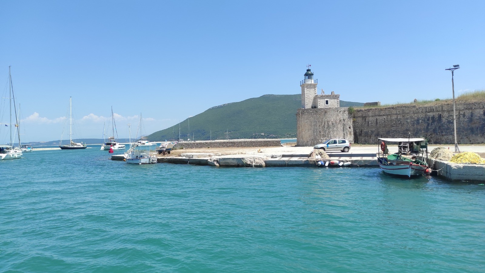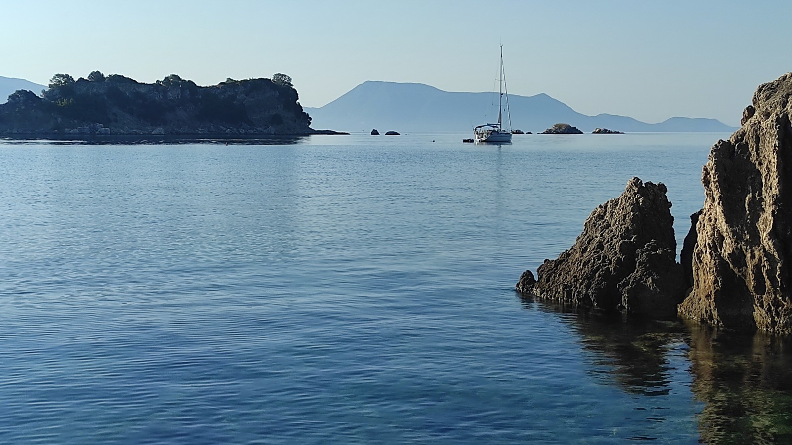 Départ pour un long trajet qui emprunte la canal de Lefkada et son pont tournant. Avant, mouillage, baignade près d'une petite plage déserte avec un chaise. Trop long l'arrêt, du coup on rate l'ouverture de midi du pont. Celle de 13hr n'aura pas lieu, on fera des ronds dans l'eau pour attendre celle de 14hr.