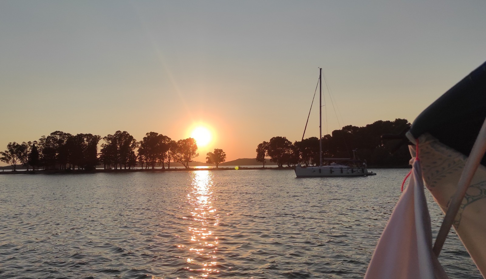 Ensuite c'est le vent qui s'invite. Jusqu'à la, moteur, mais le vent s'invite et nous passerons le canal de Preveza pour entrer dans une grande lagune avec une vitesse atteignant 7 noeuds. Nous ne nous arrêterons pas à Preveza et irons mouiller à Vonitsa, derrière une belle pinède presqu'île. Très différent des mouillages précédents. Nous irons prendre un verre (ouzo!!!) au village après le repas du soir. Passage des arches sous le pont à la rame car l'eau manque un peu.