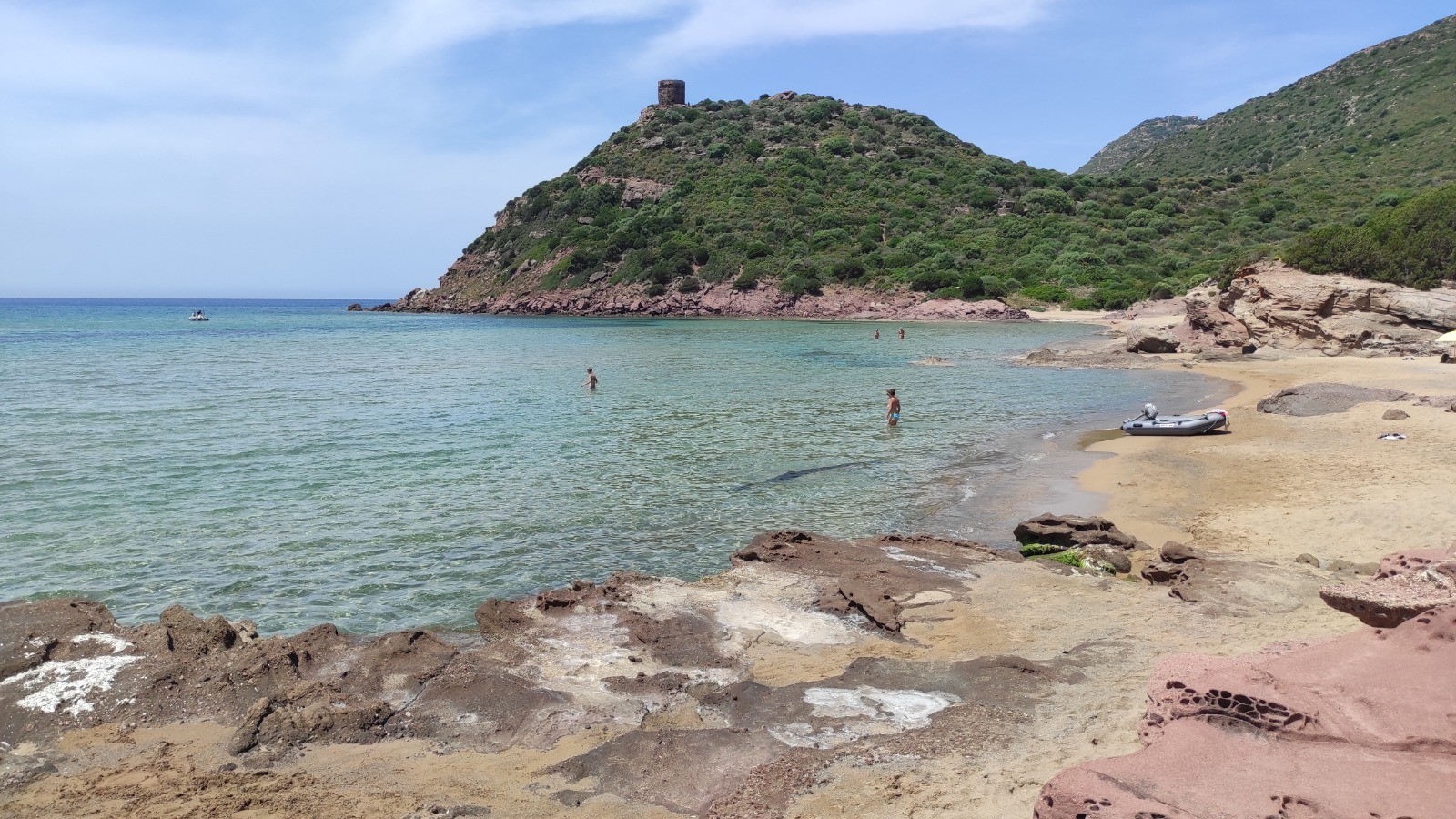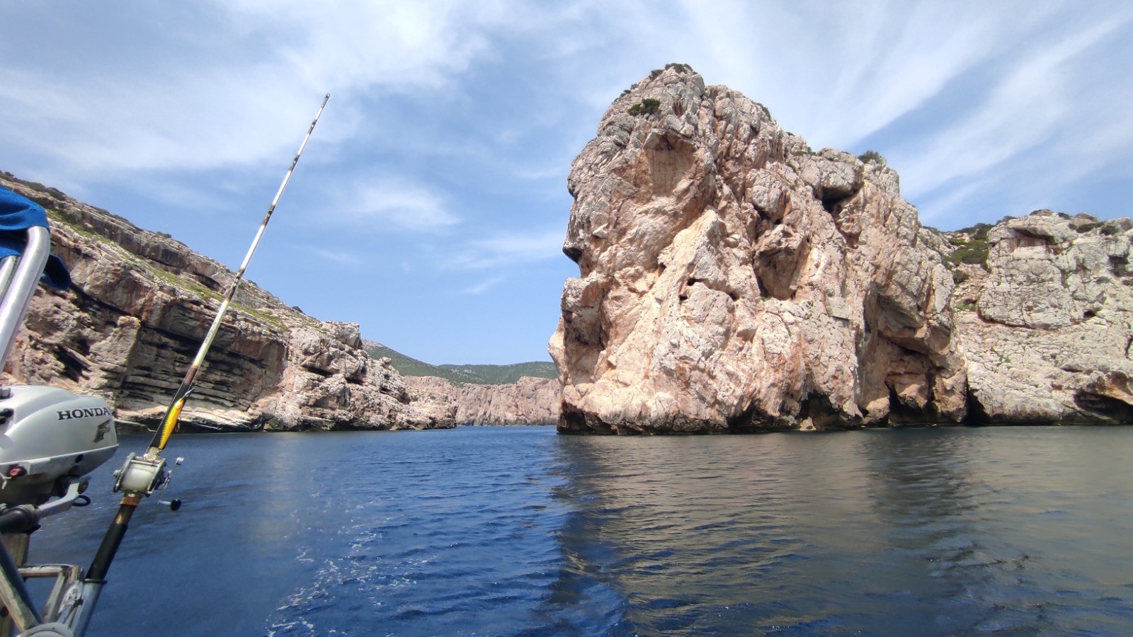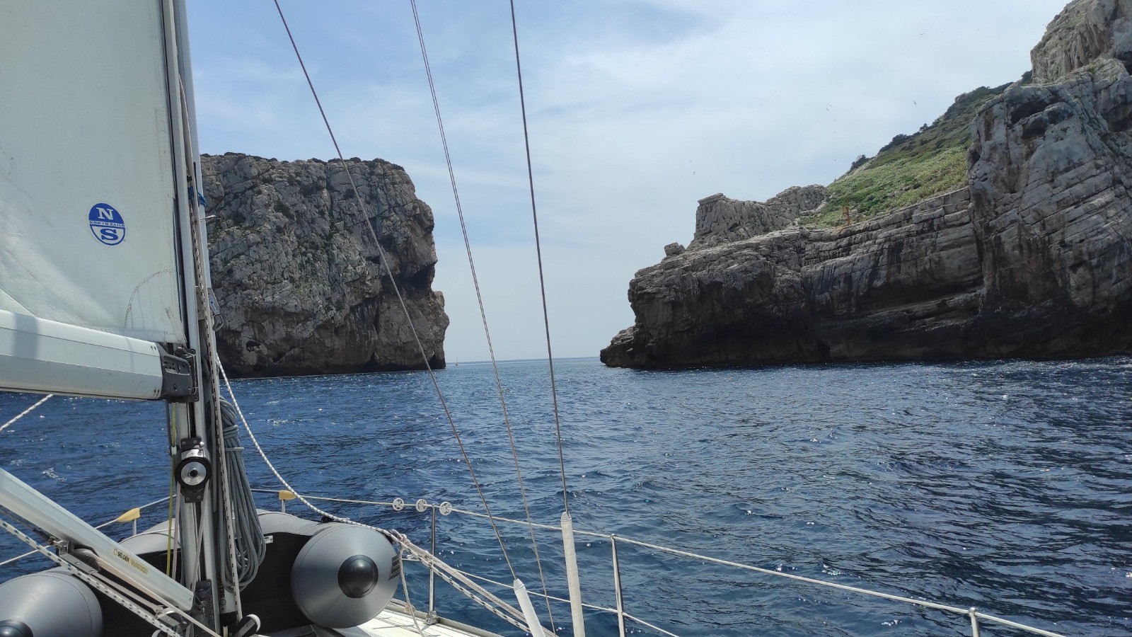 Nous traversons la passe de Fornelli en suivants les deux alignements conformément aux préconisations. Au moteur jusqu'au mouillage de midi, sur une belle plage après de hautes falaises noires.