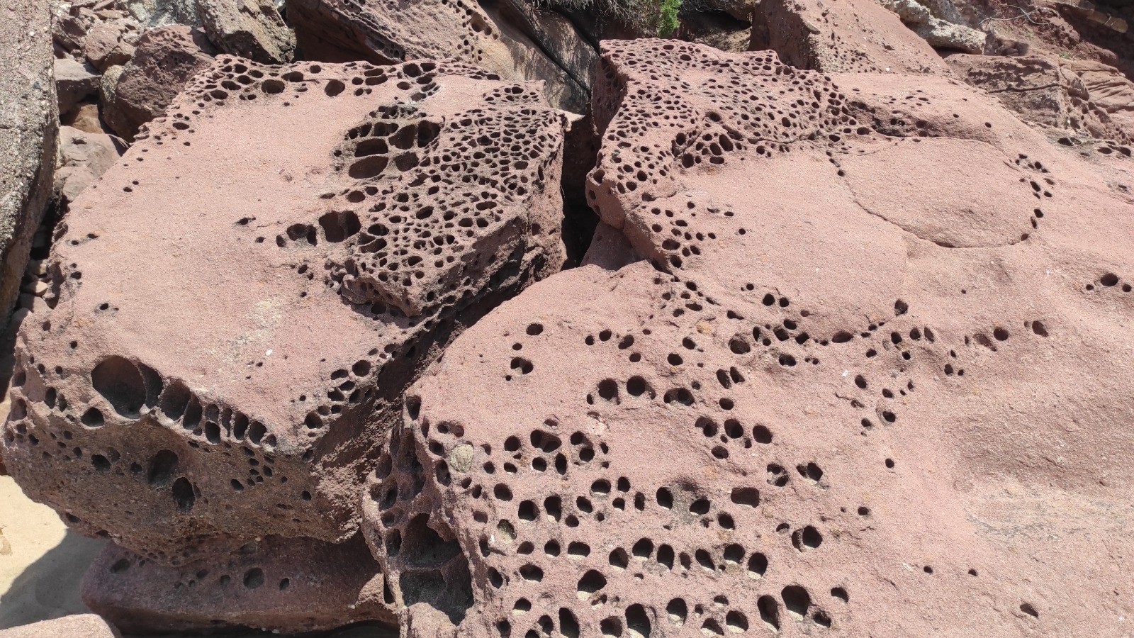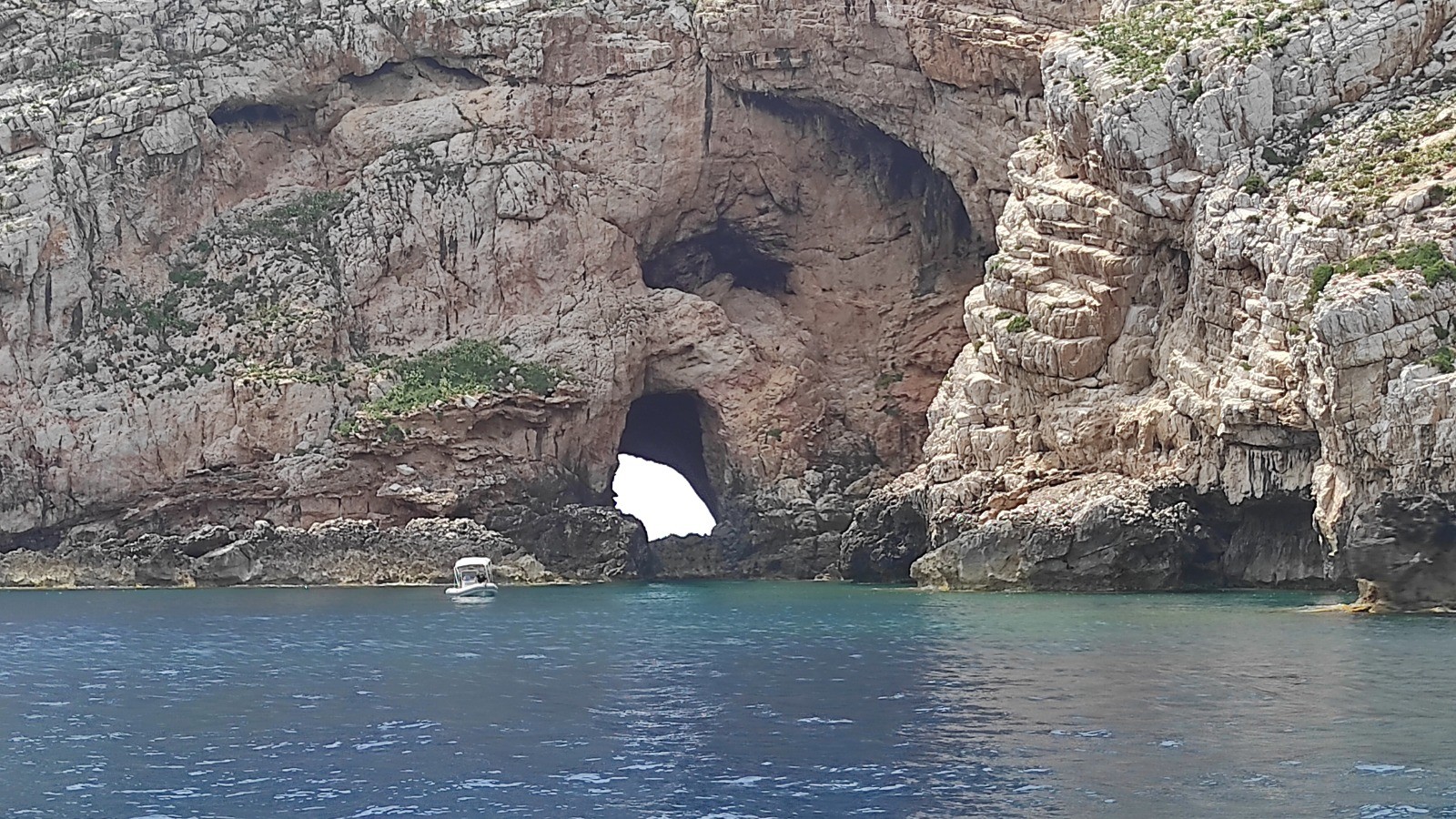 On met à l'eau l'annexe pour gagner la plage. Très belles plages avec tours et rochers troués.