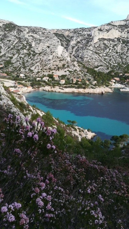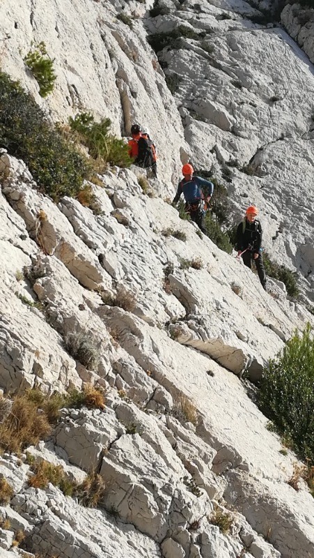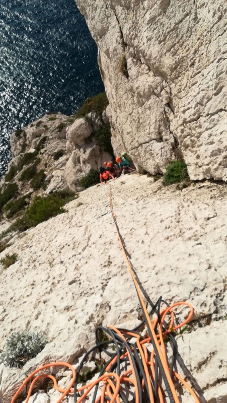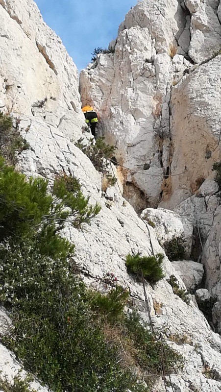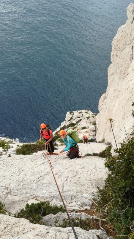 Parking du port de Sormiou, chemin du bec, montée raide à la boite à lettre équipée de cordes fixes à vérifier, nous avons préféré le rappel, on passe difficilement dans le trou il faut poser le sac.
