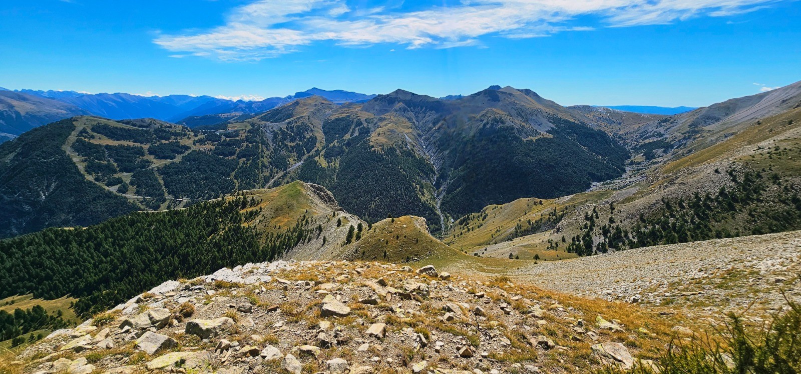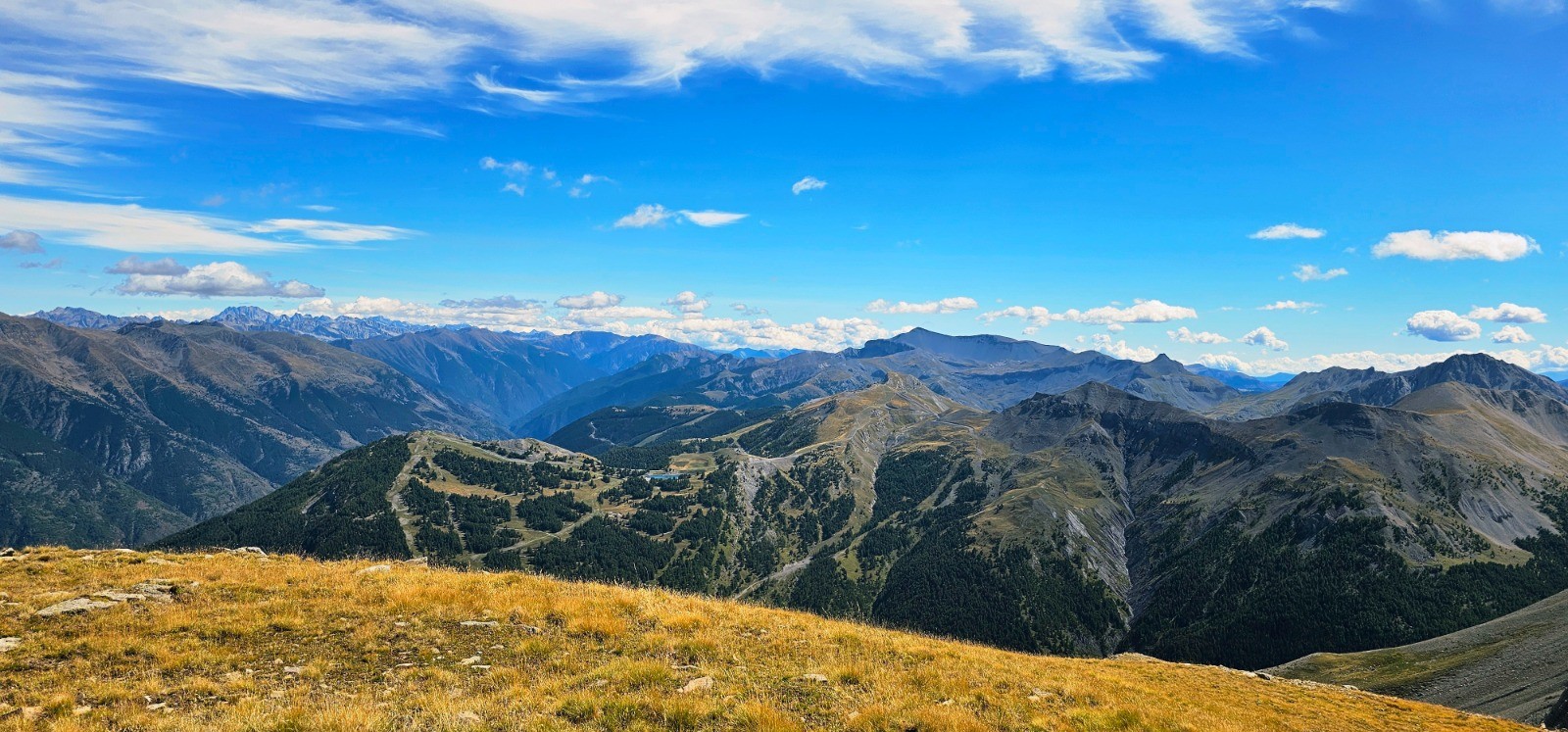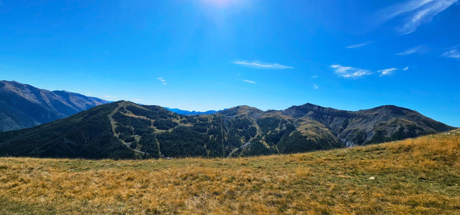 Depuis Pierre-Châtel, vue sud-est vers Auron / Las Donnas et Mounier en arrière-plan