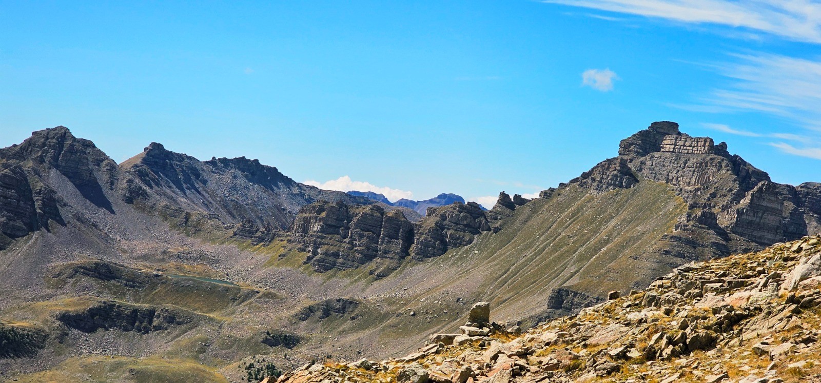 En approche sommet Pierre-Châtel. Vue rapprochée sur Fort Carra, col de la Roche Trouée et lac supérieur de Gialorgues