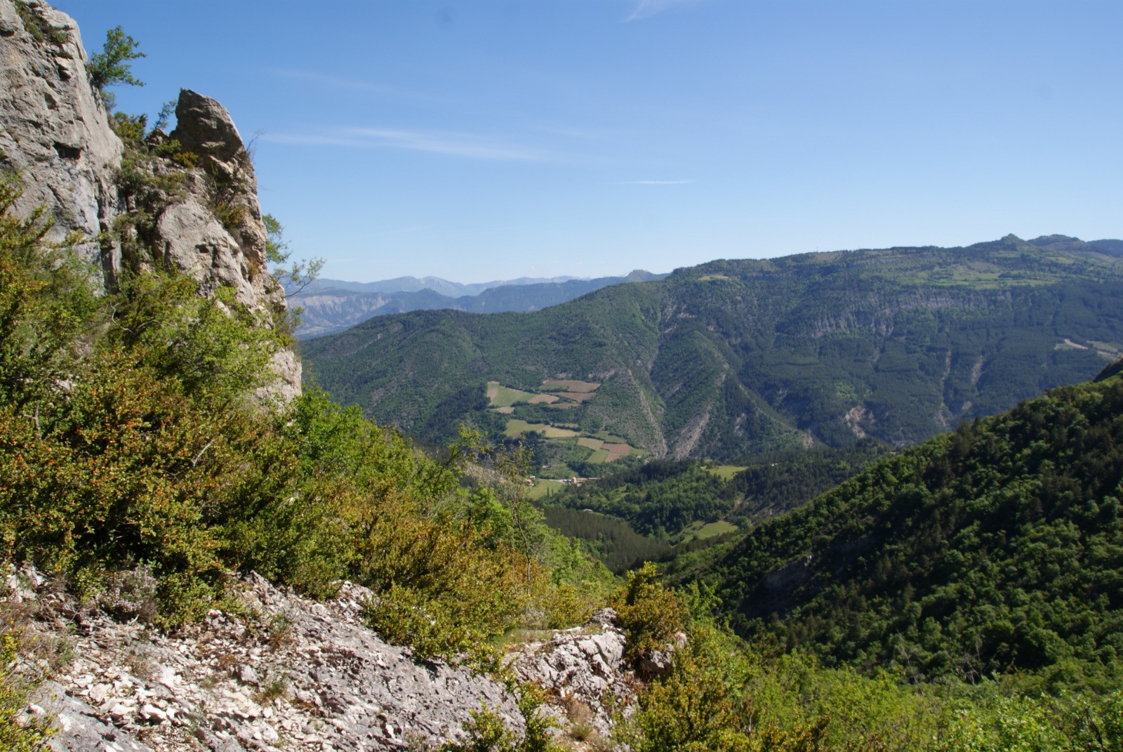 Si l'on part à gauche on est sur le sentier du cadastre. Il monte sur la croupe, relativement bien tracé mais demande un peu d'attention par endroit. Il passe au ras de l'extrémité sud de l'arrête de Rocher Laguier et abouti à des ruines à l'angle nord-est d'une parcelle cultivée située sur la piste menant à la ferme de Betton.