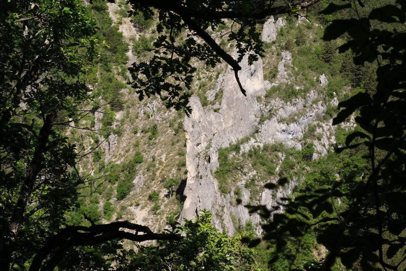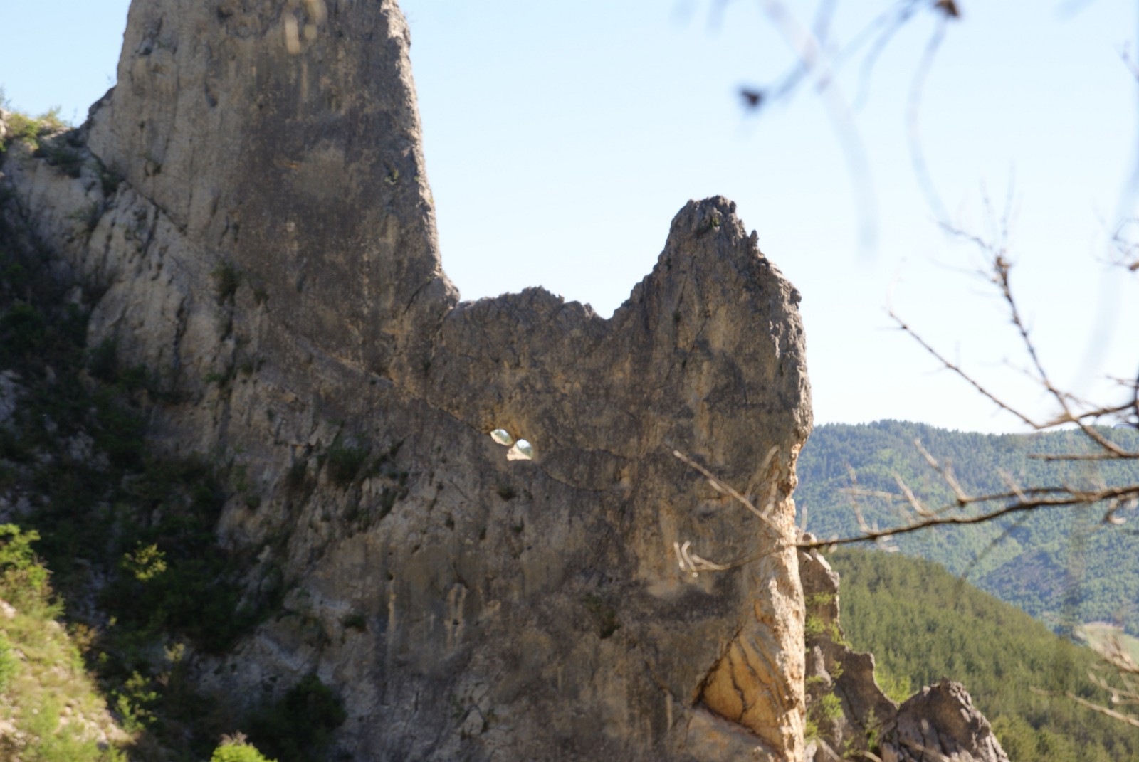 Vers 570 m, on rencontre une première bifurcation. Si l'on part à droite on se trouve sur le sentier utilisé par les canyonistes pour atteindre le point de départ de la descente du canyon de Betton. Il grimpe rive droite du canyon puis passe sur une vire exposée sécurisée par une vieille corde. Depuis cette vire on a une bonne vue sur une belle arche double sur une lame calcaire rive gauche. Je ne suis pas allé au bout de ce sentier. Sur ce sentier, peu après la bifurcation à 570 m, un sentier à gauche permet de rejoindre l'autre branche.