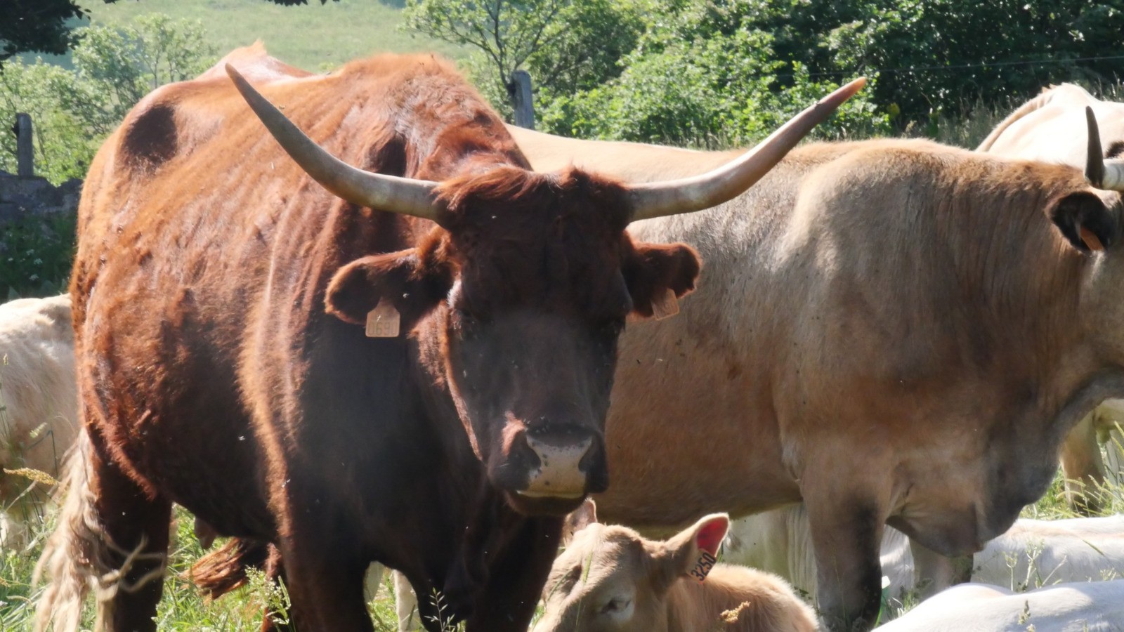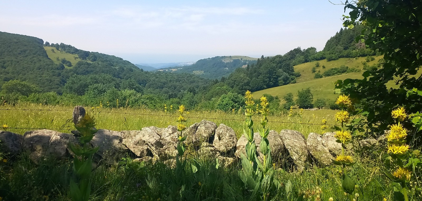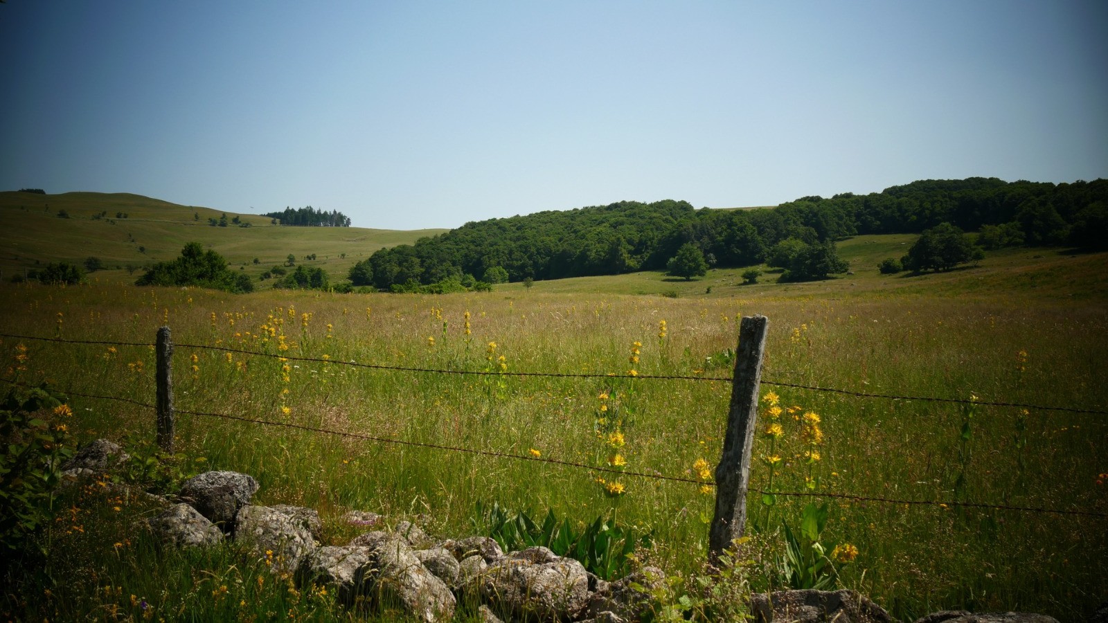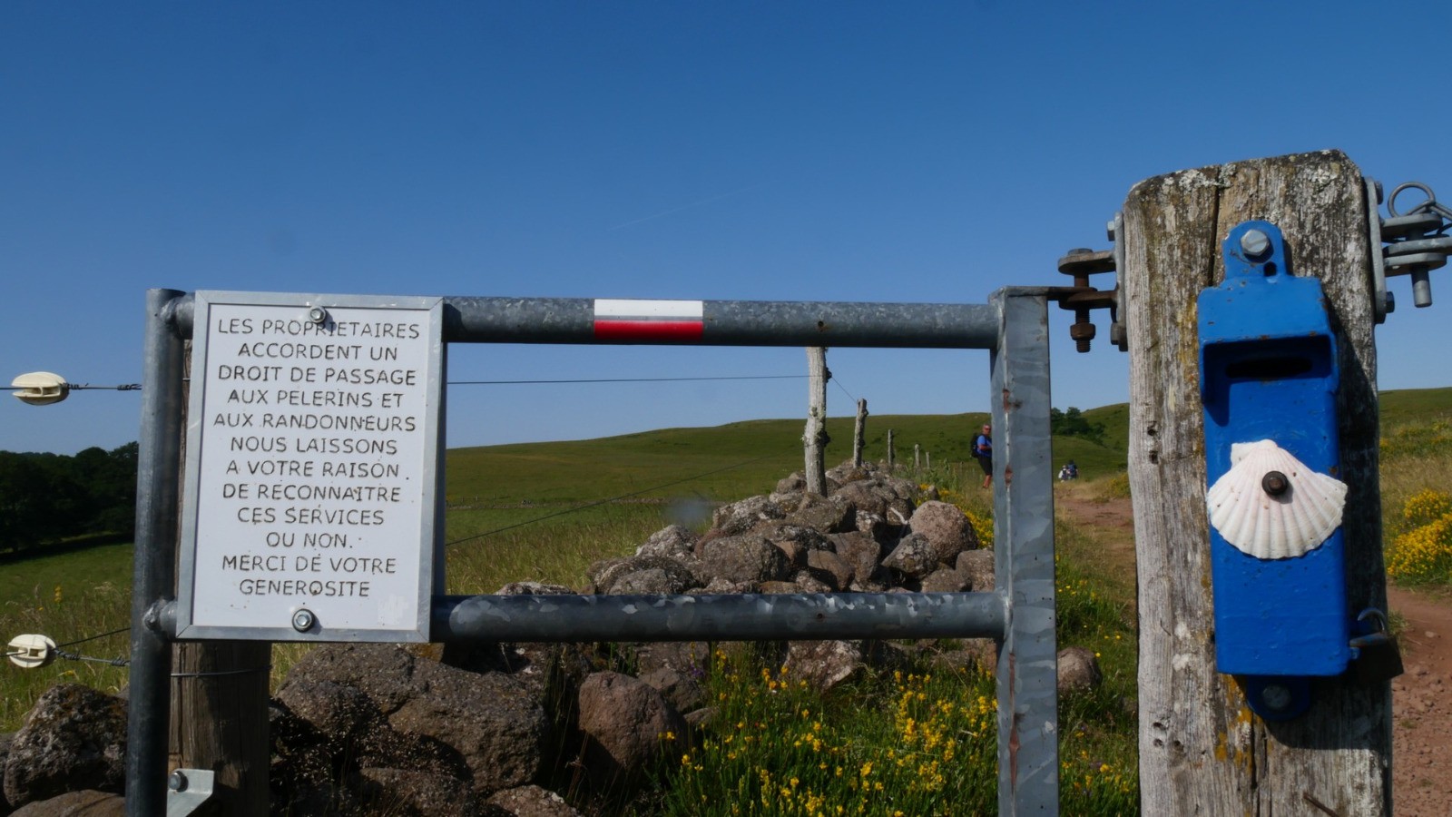 Deuxième journée du tour des monts d'Aubrac entre Nasbinals et St Chely d'Aubrac, de longues, longues sentes dans les herbages avec des troupeaux pour nous tenir compagnie souvent devant les barrières.