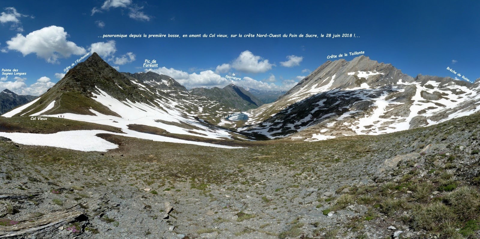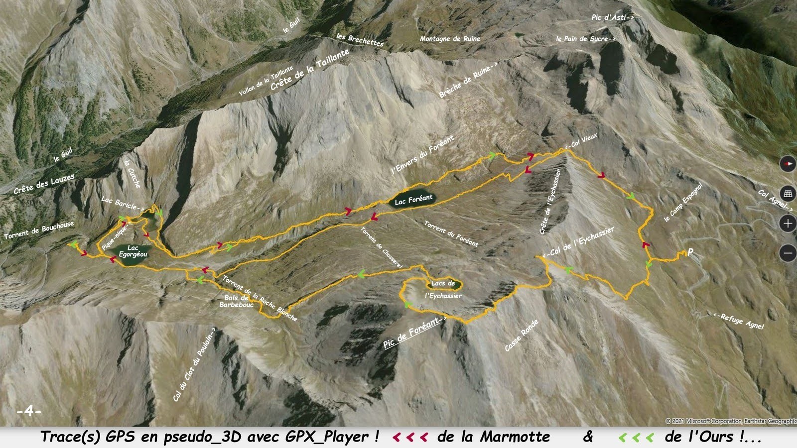 depuis le parking, 2620m, en amont du Refuge Agnel sur la D205t, route du Col Agnel > le sentier du Col Vieux jusqu'à la cote 2640m > sentier du Col de l'Eychassier > du col, suivre la bonne sente qui court sur la crête Sud-Est du Pic de Foréant ou Pointe des Fonzes, 3081m > très beau sommet, assez étroit, panorama à 360° sur tous les sommets environnants > descente par la bonne sente de la crête en demi-cercle N-E, E et S-E jusqu'aux Lacs de l'Eychassier à visiter selon son bon gré et continuer par le sentier en rive droite du Torrent de Chasserel > le traverser et poursuivre par la longue dorsale qui permet de rejoindre aisément en balcon la rive droite du Torrent de la Roche Blanche > la descendre jusqu'aux Bals de Barbebouc (d'où il est très facile de rejoindre le GR 58 & GRP Tour du Pain de Sucre ou, si vous préférez l'aventure, poursuivre en rive gauche pour les rejoindre plus bas après le franchissement un peu plus délicat d'une mini-gorge et d'une petite barre rocheuse où la prudence s'impose !) > pour le spectacle, nous avons poursuivi au-delà du Lac Egorgéou jusqu'au bord du petit plateau en balcon en rive gauche du Torrent de Bouchouse avant notre demi-tour et notre large visite des Lacs Baricle > retour par la rive droite en respectant le plus scrupuleusement possible les zones exclusives de protection de la biodiversité balisées par une cordelette piquetée et pictogrammes jusqu'en amont du Lac Foréant > poursuivre par le beau patchwork d'affleurements d'anciens polis glaciaires et de pelouses alpines pour ne traverser qu'au plus près du Col Vieux > le rejoindre par son ancien sentier > retour parking par le GR 58.