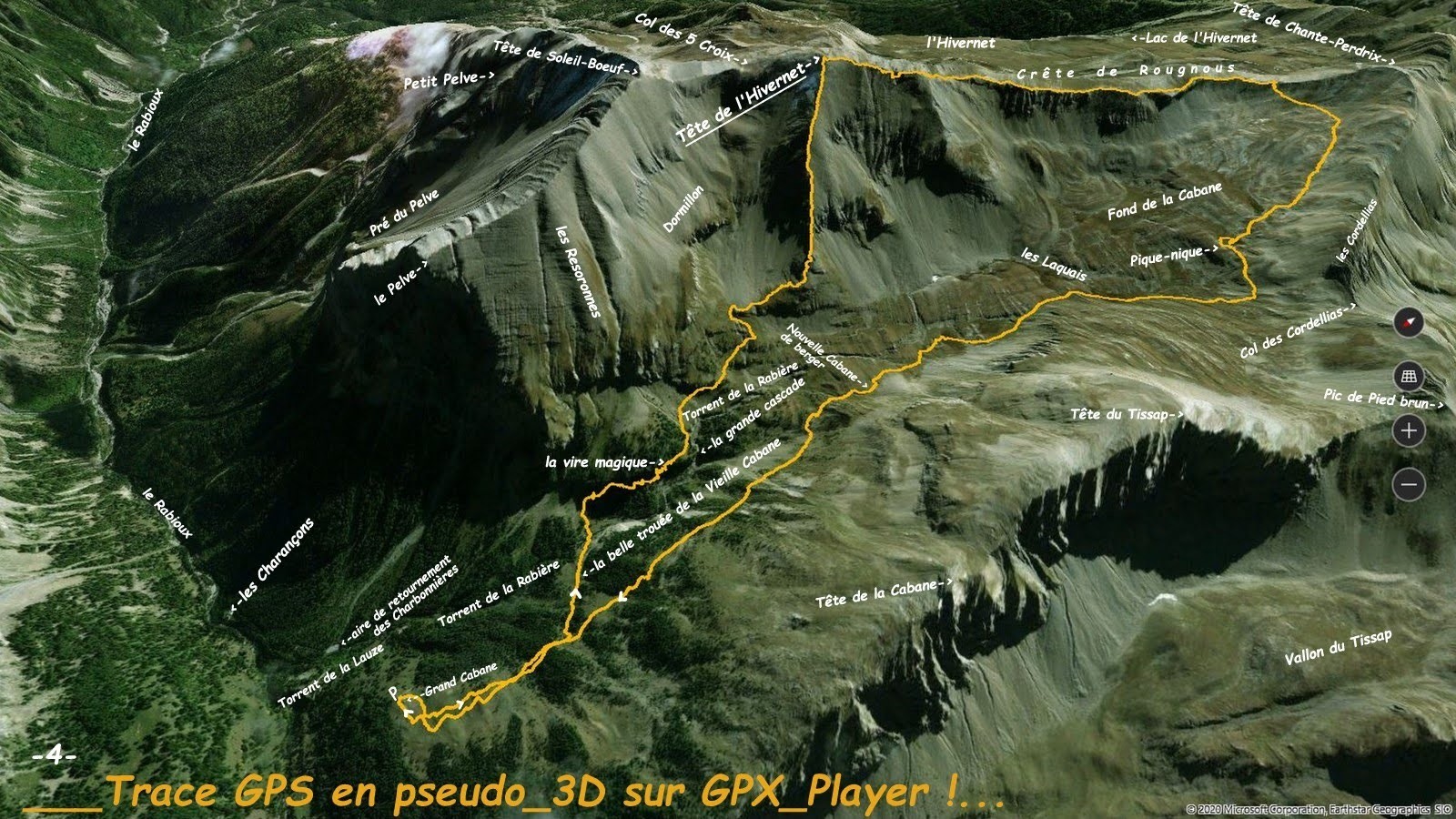 depuis la Cabane (ou Grand Cabane), 180? m > la ligne cairnée de la nouvelle cabane de berger (225? m sous la Tête du Tissap) jusqu'à 1950 m environ, lieu-dit la Vieille Cabane, descendre d'une trentaine de m pour ensuite rejoindre à niveau le Torrent de la Rabière qui traverse un joli petit plateau > le traverser pour remonter en face en décrivant un arc de cercle jusqu'à trouver une bonne sente à moutons qui monte jusqu'au pied de la falaise, la suit et la traverse par une providentielle rampe herbeuse très confortable > continuer et traverser en montant le talweg des Reseronnes et, par une évidente diagonale ascendante, rejoindre l'arête Nord-Ouest de la Tête de l'Hivernet qu'il suffit de remonter au mieux (quelques petits passages où il faut s'aider des mains, 2a maxi, peu exposé, mais où il vaut mieux ne pas chuter!) > descente par la classique arête Sud-Ouest là encore avec beaucoup de prudence > enchaînement avec la plus débonnaire Crête de Rougnous jusqu'au collet 2606 m avant la Tête de Chante-Perdrix > retour au mieux par le grand giratoire du Fond de la Cabane de manière à visiter ses plus conséquentes zones humides et ce qu'il reste de ses différents lacs > la nouvelle cabane de berger et rallier la Grand Cabane par sa désagréable ligne de cairns.