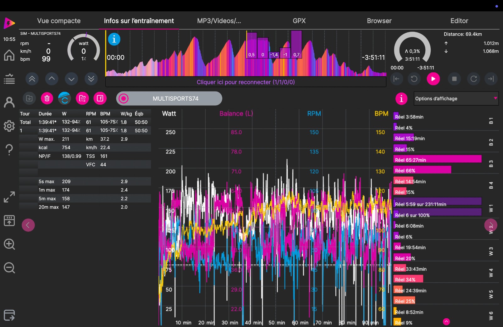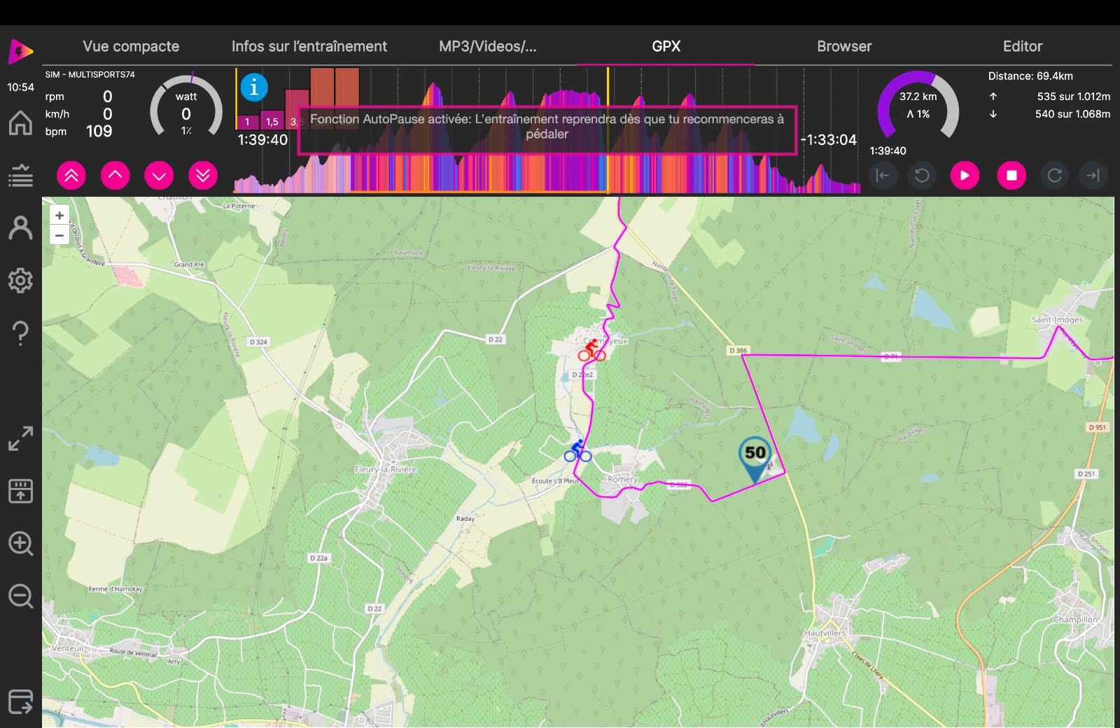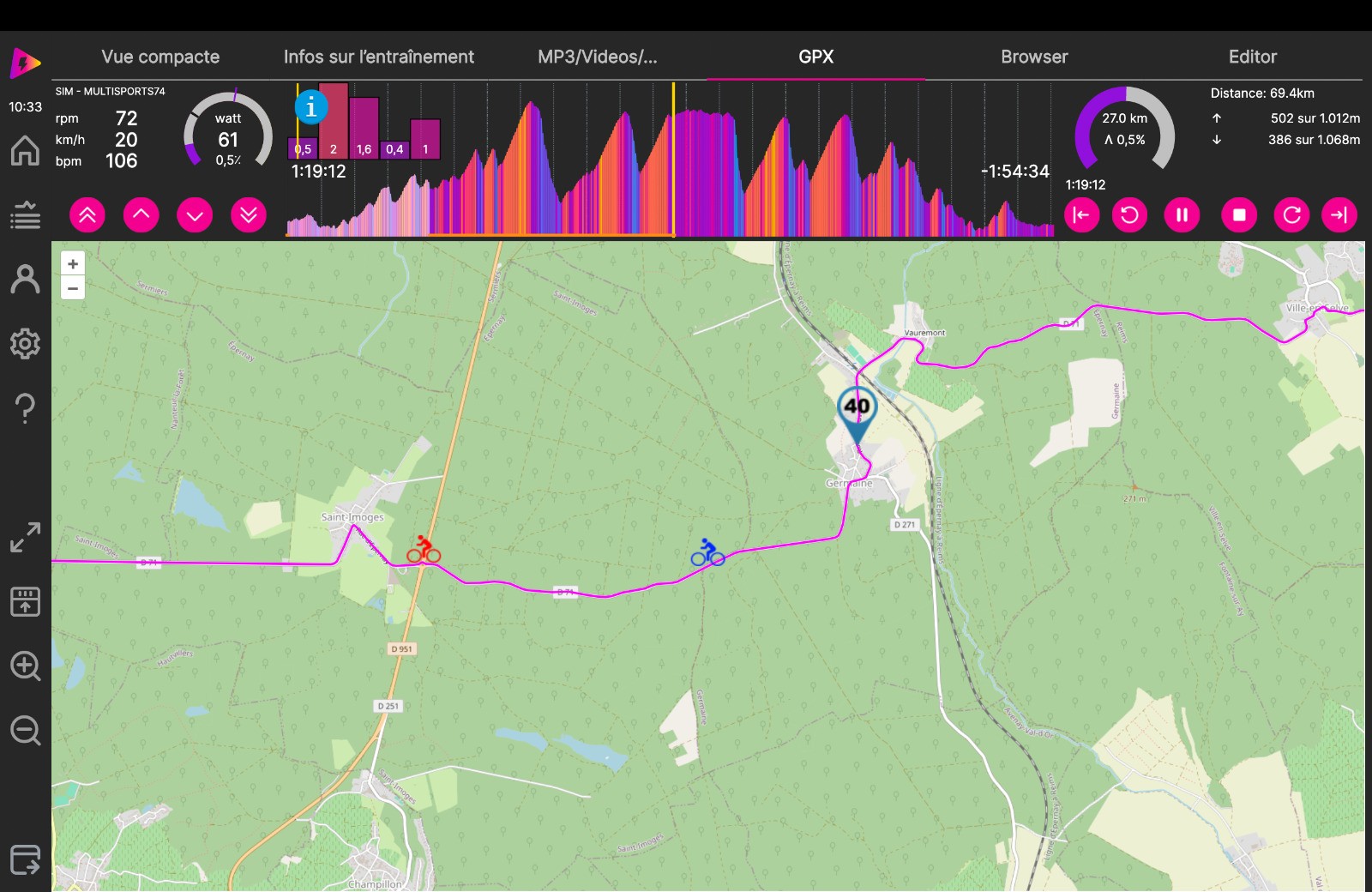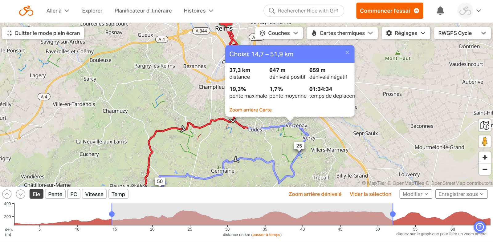 Séance d'HT, puisque le temps est assez pluvieux : mon départ se fait sur une section du parcours réalisé la semaine écoulée : à la sortie de CHIGNY les ROSES je file en direction des FAUX de VERZY par VERZENAY. A LOUVOIS je passe par VILLE en SELVE, GERMAINE , St IMOGES, ROMERY. Sur cette section en temps réel j'ai mis 1H34'34" et avec le HT : 1h39'41" soit : 0h05' 07" de plus. Je suis moins efficace dans les cotes où je perds trop de temps. Sur le plat j'avance à priori correctement et dans les descente je suis obligé de tourner assez vite les jambes. Dans son ensemble la séance est positive mais sans plus.