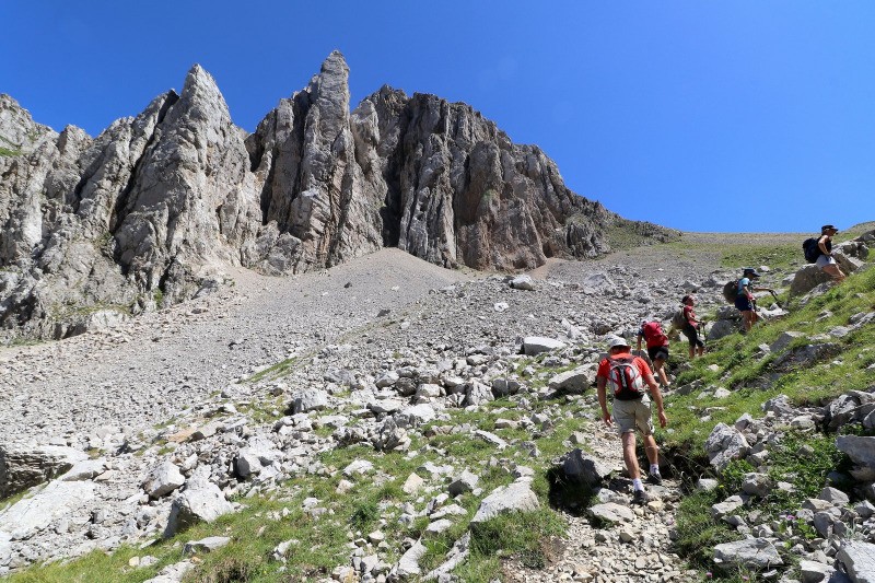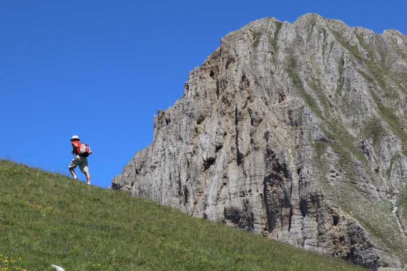 La suite est plus sauvage et se fait dans des pentes raides et pierreuses ou quelques cairns sont visibles . On longe ensuite la crête herbeuse qui domine le