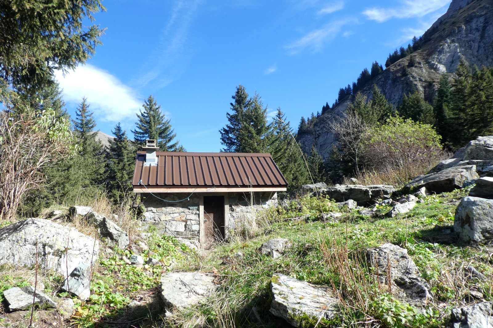 Petite cabane rustique dans un environnement sauvage.