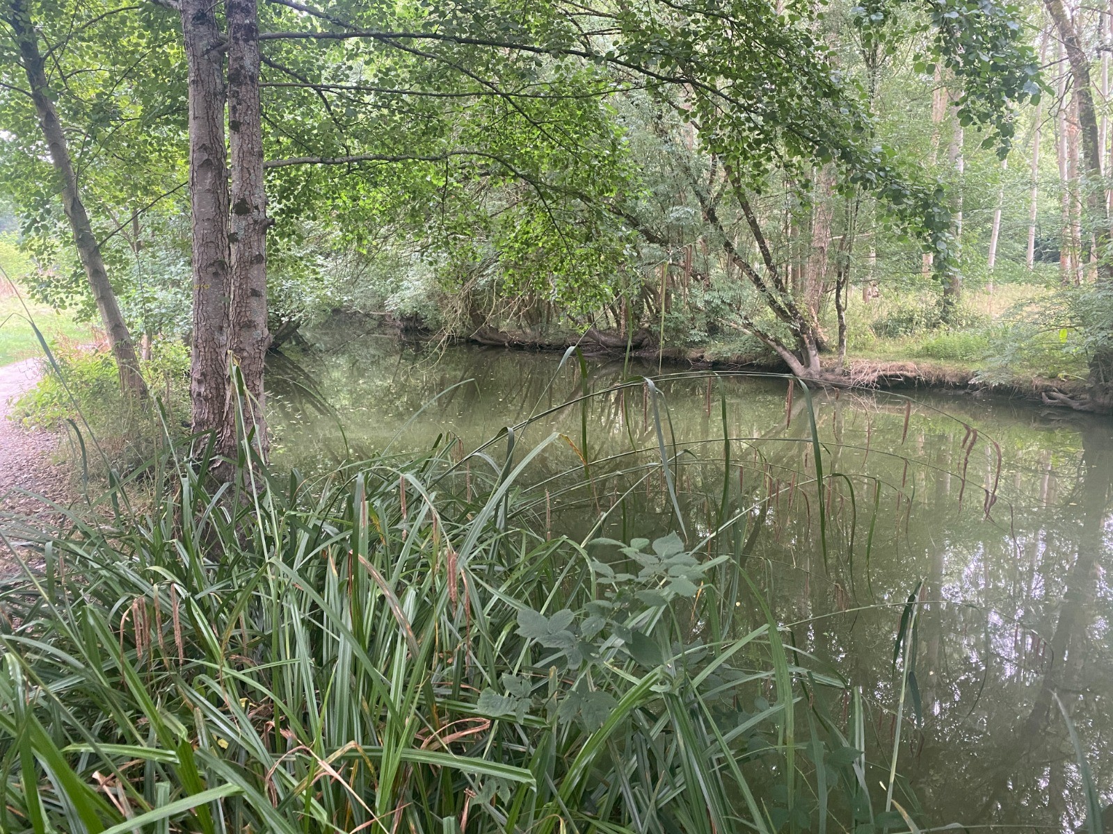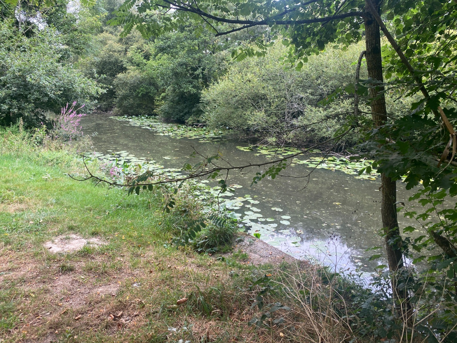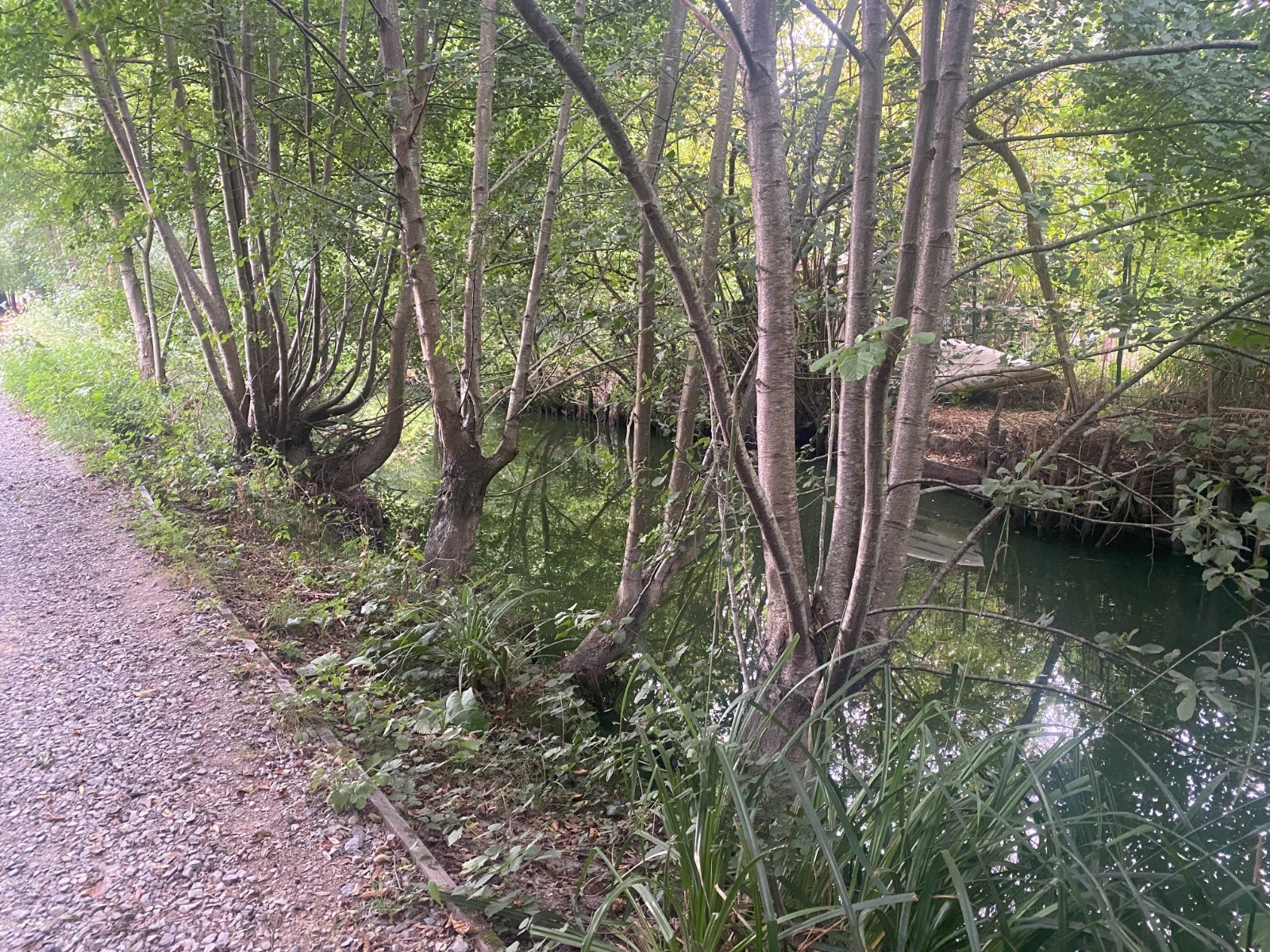 Rivière assez discrète cachée par une végétation luxuriante faite de ronces et iris des marais.