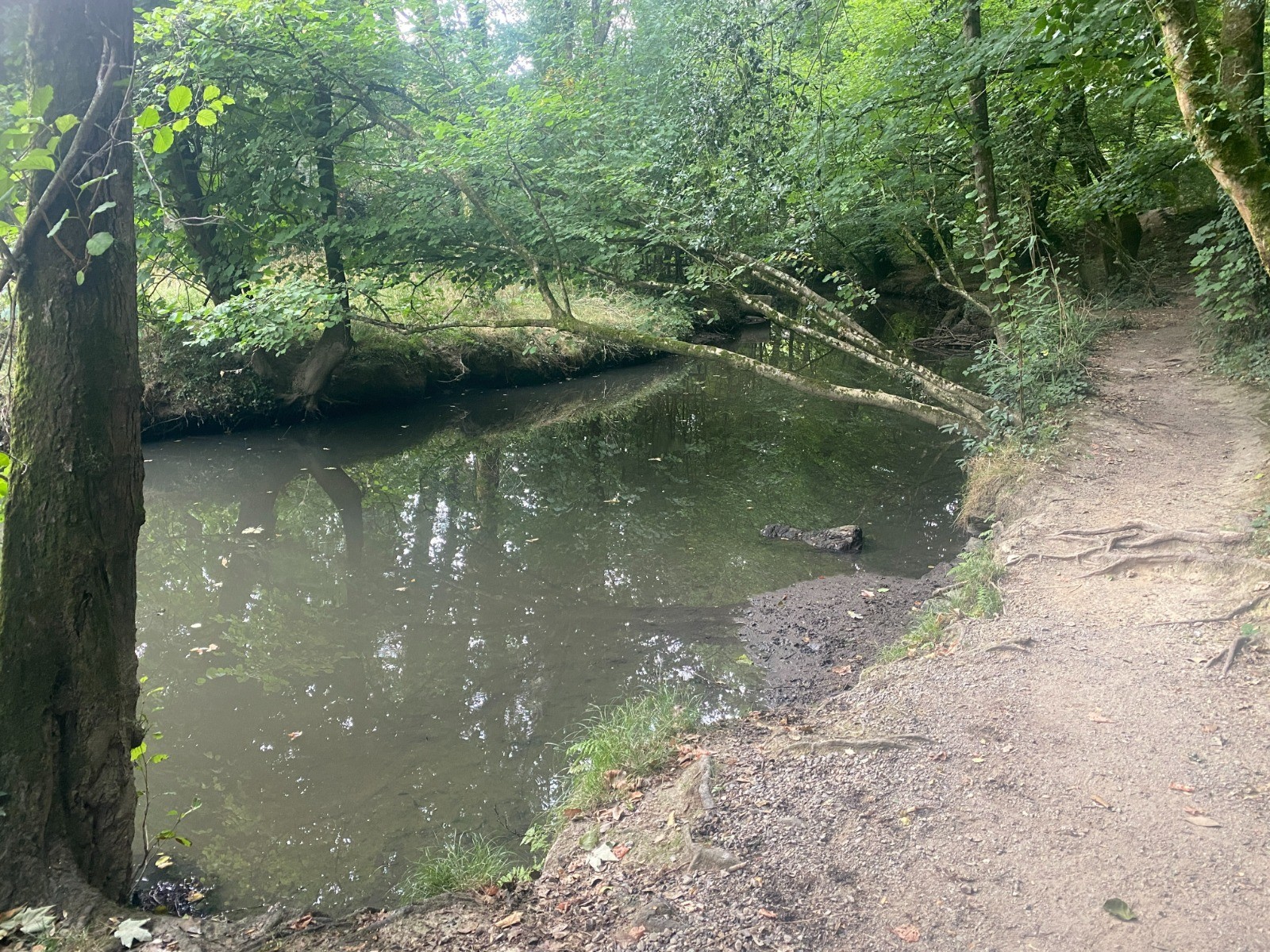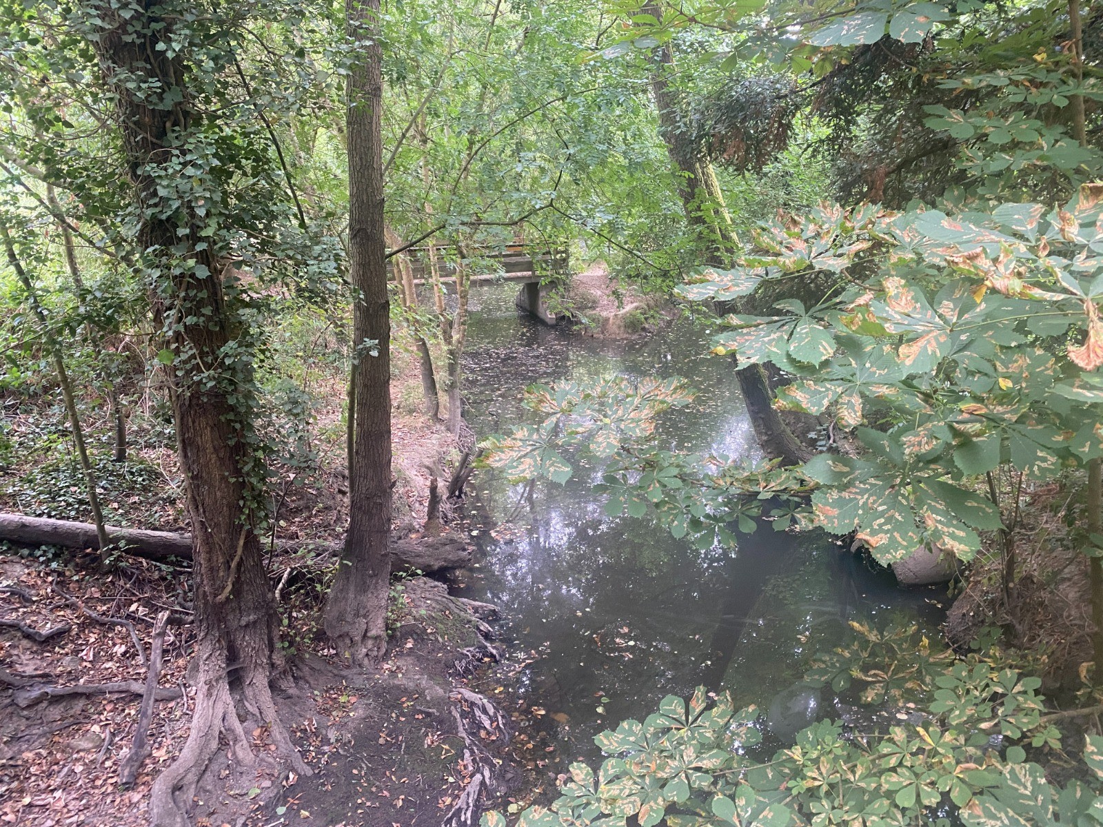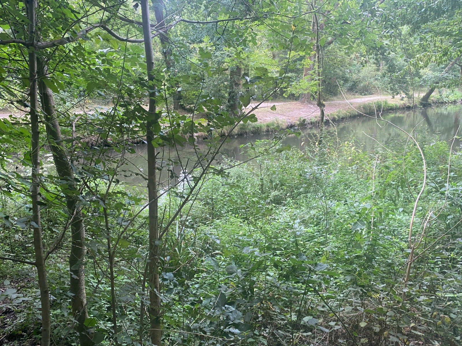 Rivière assez discrète cachée par une végétation luxuriante faite de ronces et iris des marais.