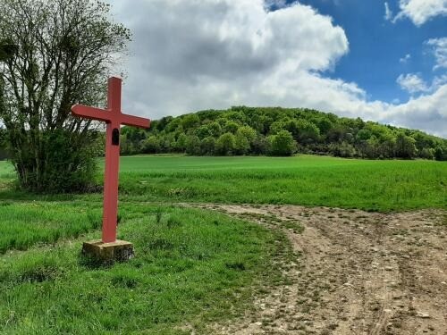 5 - A Courcelles, aller tout droit, traverser la départementale, puis avant le pont de chemin de fer, tourner à droite et suivre tout droit jusqu’à la Croix Rouge. A la Croix Rouge, continuer tout droit, le chemin monte jusqu’au col entre les deux Montois , puis redescend pour rejoindre le route.