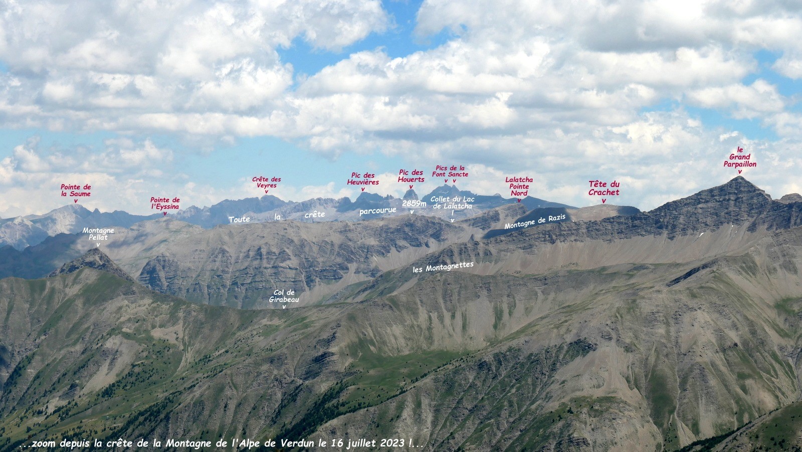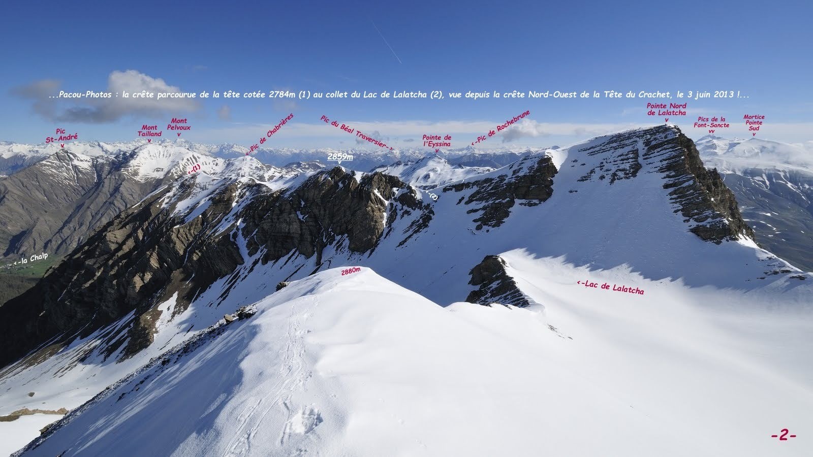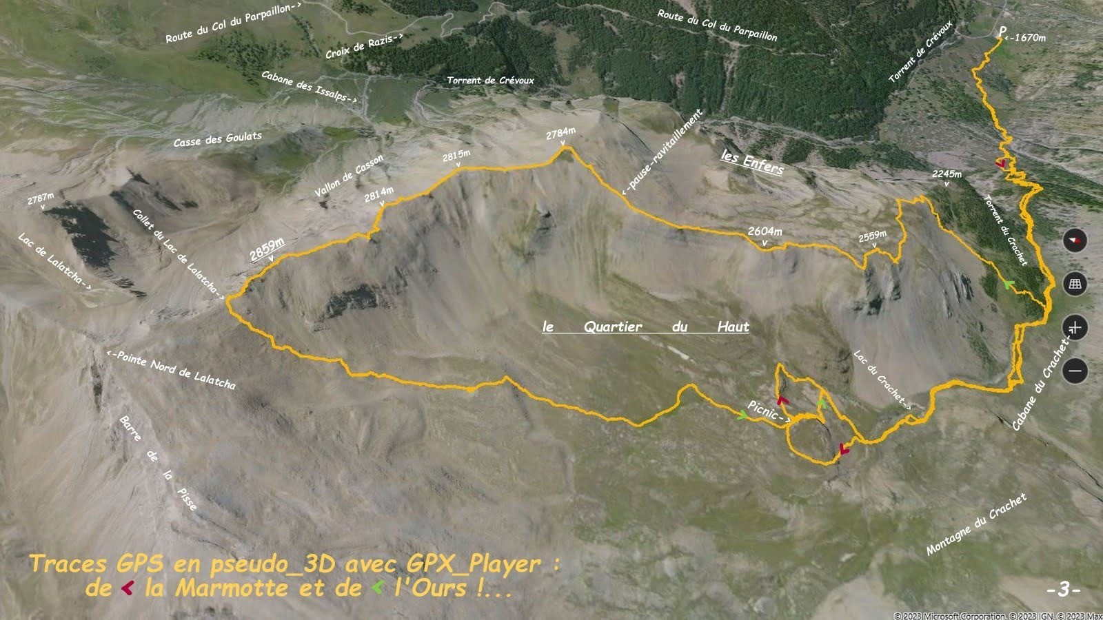 Parcours Intégral de la Crête sans nom qui domine à l'Est les falaises des Enfers et à l'Ouest le Quartier du Haut; retour par le sentier du Lac de Lalatcha via le Lac et la Cabane du Crachet, depuis le 2ième P après la Chalp, Crévoux, Hautes-Alpes.Randonnée PédestreTrace cachée