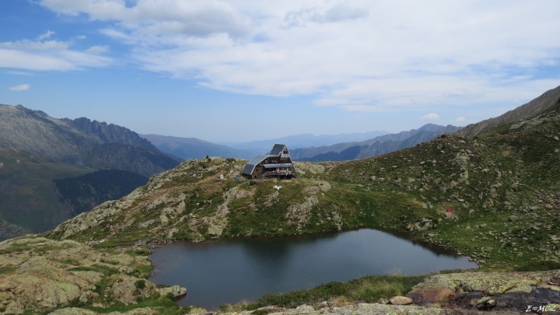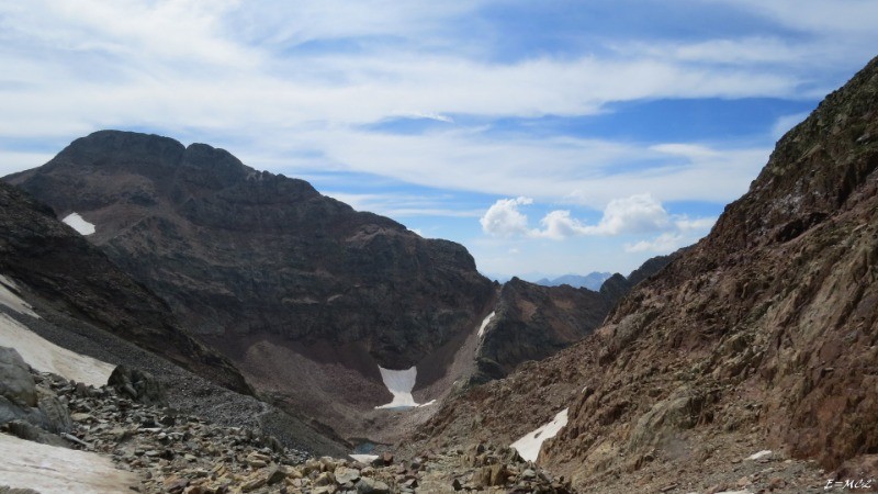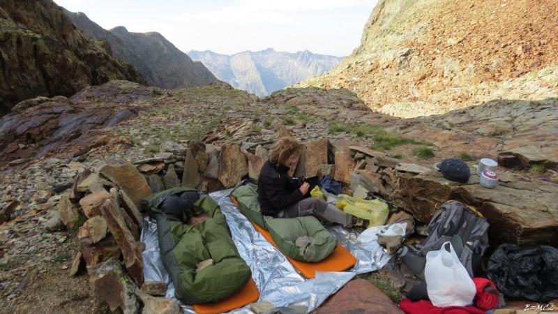 Après le refuge, le ventre un peu lourd, on a continué sur le sentier du Montcalm. A 2900 m d'altitude on aborde un vallon axé est - ouest, sur la gauche on continu vers le Montcalm, descendre sur la droite vers l'Etang de la Coumette d'Estats et le Port de Sullo. Suivre le sentier sur la rive gauche du vallon et le quitter à l'approche de l'étang pour aller vers le déversoir sur la droite et faire une centaine de mètres pour trouver l'aire de bivouac.