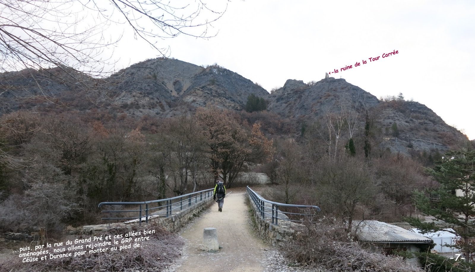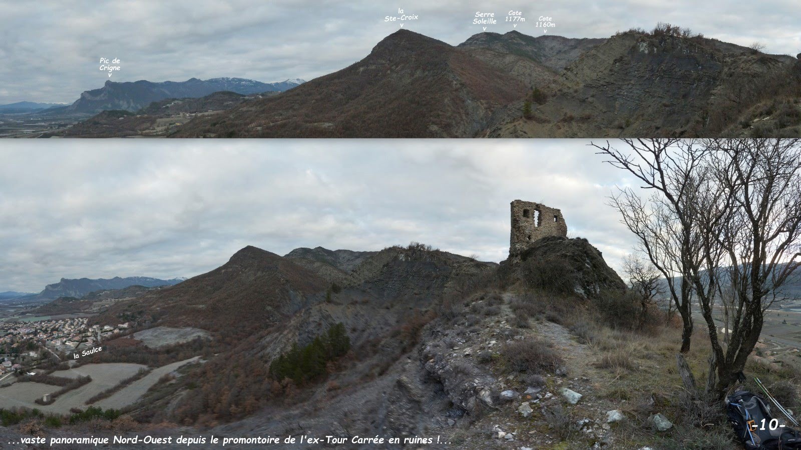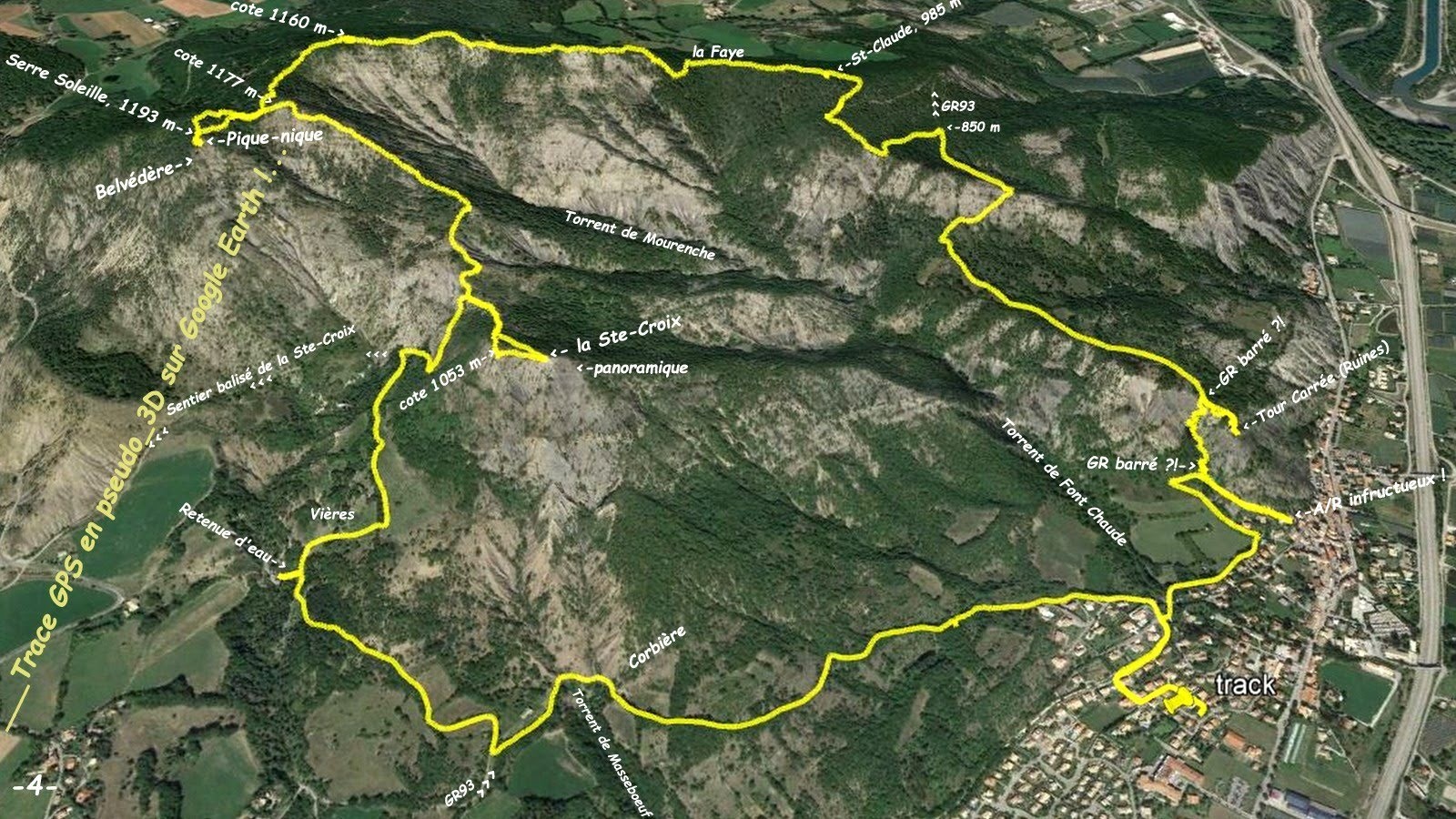 depuis la Saulce, suivre le GR93-GRP Entre Céüse et Durance (mal entretenu et balisage confus dans le ravin d'accès à la ruine de la Tour Carrée (*)) jusqu'à la cote 850 m > regagner le serre nommé St-Claude que nous nous sommes amusés à traverser puis celui de la Faye > suivre au mieux la crête en bordure du ravin qui passe par les cotes 1160 et 1177 m jusqu'à Serre Soleille dont il serait dommage de se priver du belvédère Sud-Ouest > revenir à la cote 1177 m, en descendre la crête Sud-Est puis Sud-Ouest jusqu'au collet coté 982 m (émaillée de quelques petits passages rocheux, un peu gravillonneux, mais sans aucune autre difficulté technique) > A/R à la Ste-Croix sans oublier, hors-sentier, la bosse de l'ex-prieuré, 1053 m > revenir par le sentier balisé jusqu'au raccourci de Vières qui ramène au GR93 à la cote 745 m, et par celui-ci jusqu'à la Saulce et le parking de départ choisi (très dégradé à son arrivée au-dessus des derniers lotissements(*)).