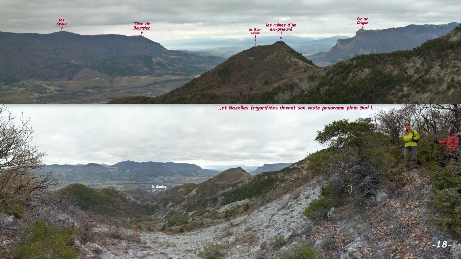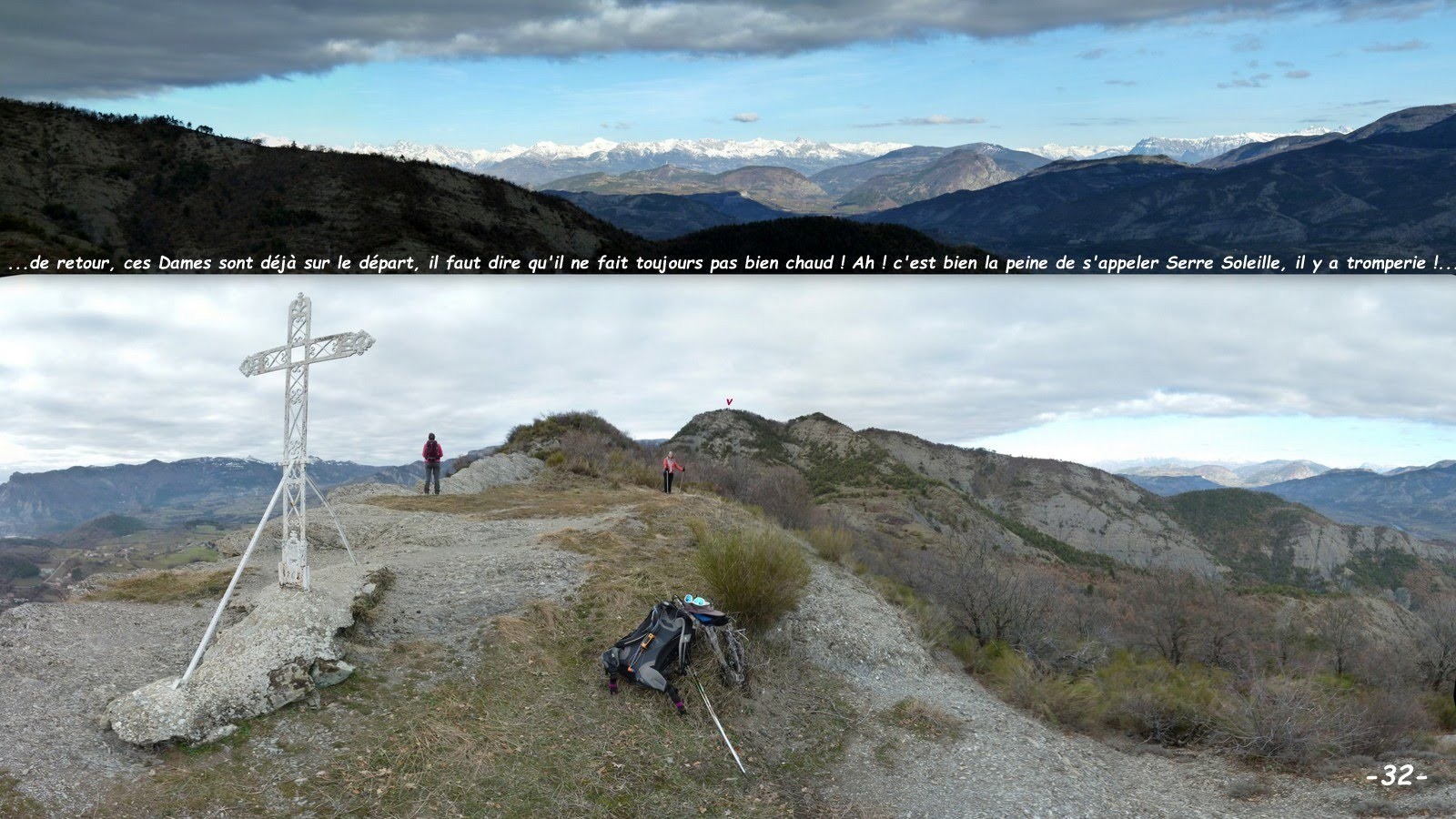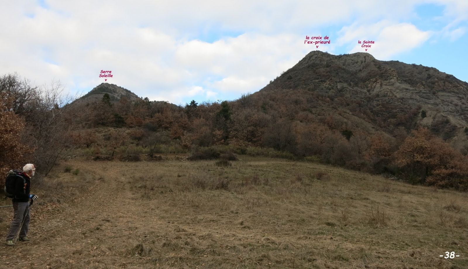 Cette chaîne de serres, constituant la branche Est du fer-à-cheval qui enserre depuis le Nord la plaine de Vitrolles à Lardier-et-Valença n'a certes pas l'attrait de ses plus prestigieux autres composants, à savoir la Crête des Selles avec son emblématique Pic de Crigne à l'Ouest et la couronne de Céüsette au Nord. Cependant, avec ses versants Sud arides et relativement escarpés, terrain favori des chamois, elle ne pouvait pas laisser indifférent le vieux bouc cévenol, prénommé l'Ours qui, se prenant pour un bouquetin haut-alpin, a pensé qu'ils suffiraient à occuper une de ces courtes journées hivernales. Le but de cette randonnée, en partie sauvage, étant de parcourir au mieux les crêtes qui entourent les ravins des Torrents de Mourenche, de Font Chaude et de Masseboeuf au Nord de la Saulce, en passant bien évidemment par Serre Soleille, 1193 m, le point culminant de la chaîne et celui, de loin le plus visité, supportant la Sainte-Croix, 1053 m. Le tout constituant une randonnée d'envergure très modeste, mais offrant de larges panoramas sur toute cette portion de la moyenne vallée de la Durance et demandant un bon sens de l'orientation dans sa partie hors-sentier qu'il est toujours possible de varier au gré de chacun.