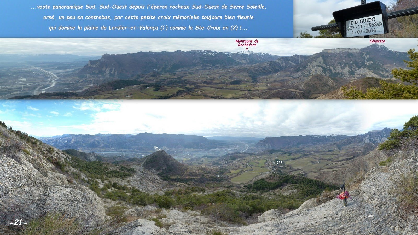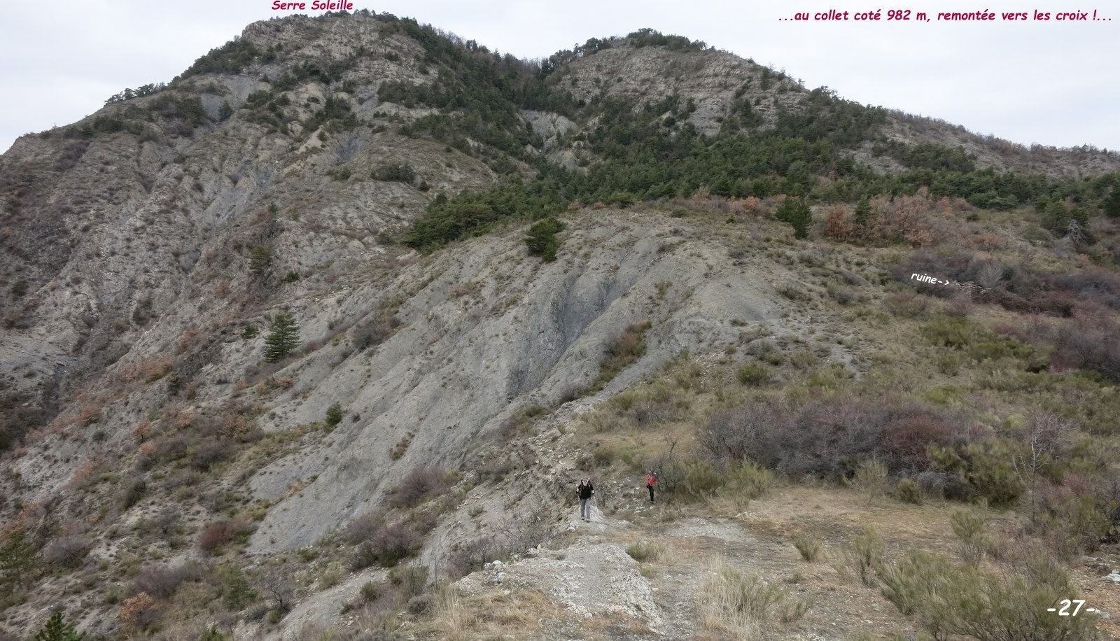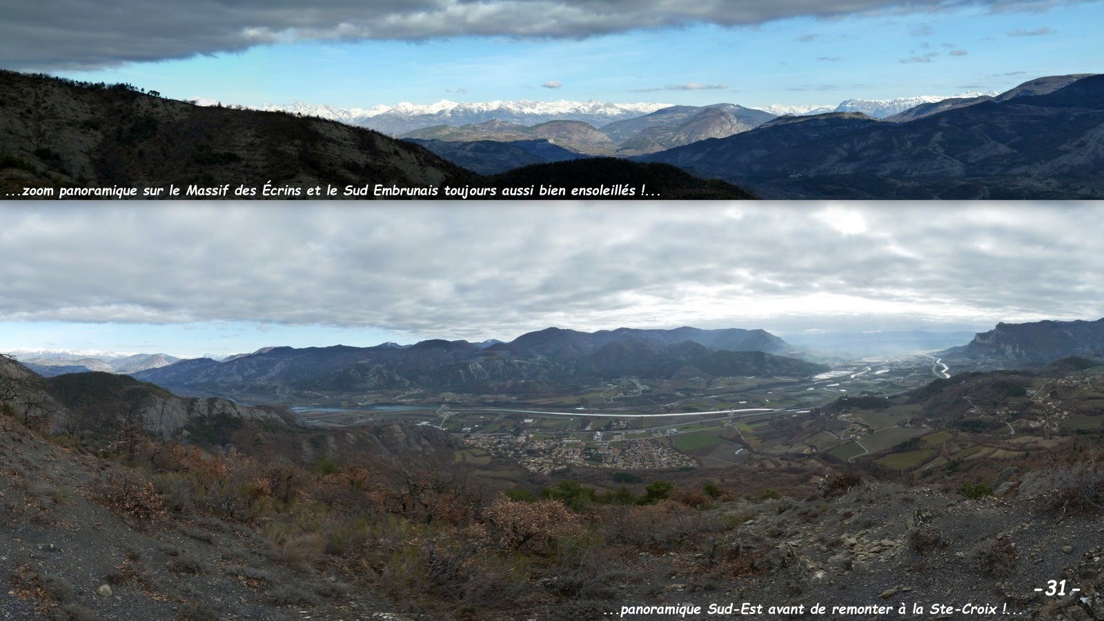 Cette chaîne de serres, constituant la branche Est du fer-à-cheval qui enserre depuis le Nord la plaine de Vitrolles à Lardier-et-Valença n'a certes pas l'attrait de ses plus prestigieux autres composants, à savoir la Crête des Selles avec son emblématique Pic de Crigne à l'Ouest et la couronne de Céüsette au Nord. Cependant, avec ses versants Sud arides et relativement escarpés, terrain favori des chamois, elle ne pouvait pas laisser indifférent le vieux bouc cévenol, prénommé l'Ours qui, se prenant pour un bouquetin haut-alpin, a pensé qu'ils suffiraient à occuper une de ces courtes journées hivernales. Le but de cette randonnée, en partie sauvage, étant de parcourir au mieux les crêtes qui entourent les ravins des Torrents de Mourenche, de Font Chaude et de Masseboeuf au Nord de la Saulce, en passant bien évidemment par Serre Soleille, 1193 m, le point culminant de la chaîne et celui, de loin le plus visité, supportant la Sainte-Croix, 1053 m. Le tout constituant une randonnée d'envergure très modeste, mais offrant de larges panoramas sur toute cette portion de la moyenne vallée de la Durance et demandant un bon sens de l'orientation dans sa partie hors-sentier qu'il est toujours possible de varier au gré de chacun.