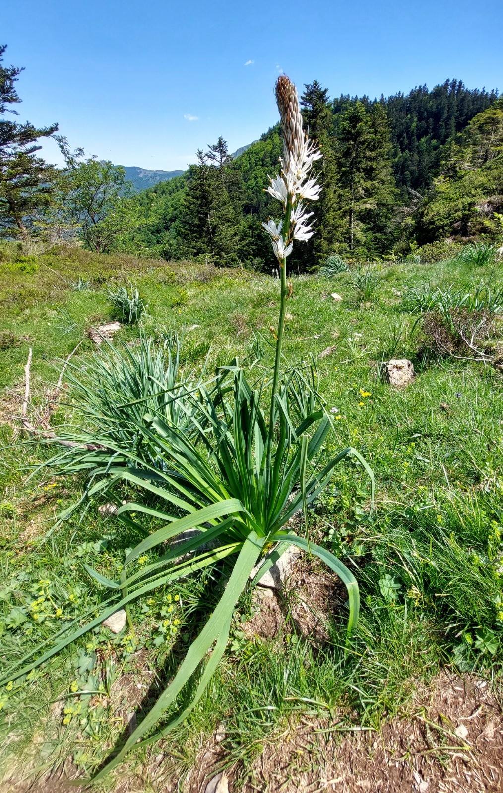 Il le quitte à la descente sous l'étang de Guzet, pour prendre un balisage jaune qui comporte des marquage lettrés ( D et E - marquage des circuits de trail de la station d'aulus les bains)