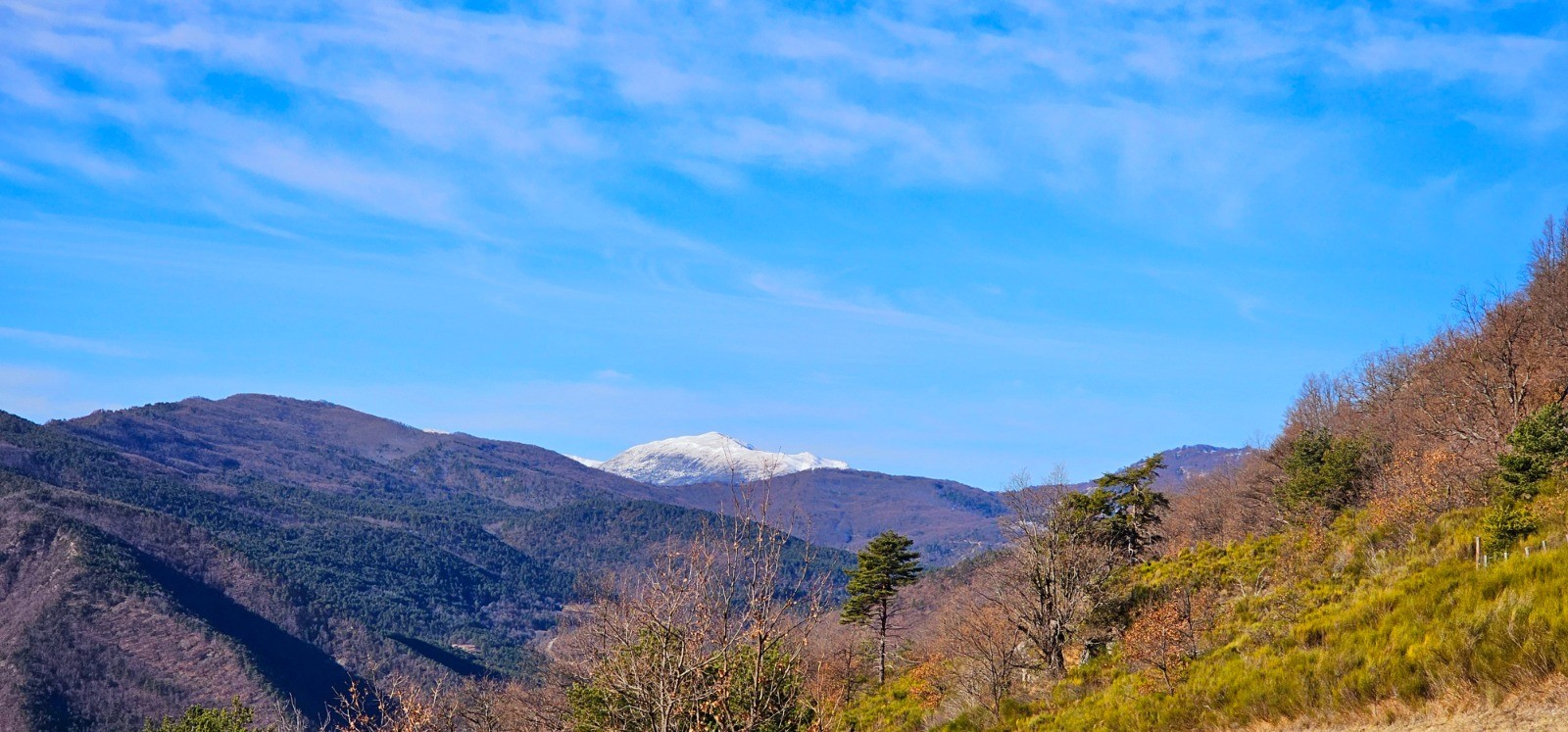 Descente vers Amirat. Vue Mercantour enneigé en ligne d'horizon