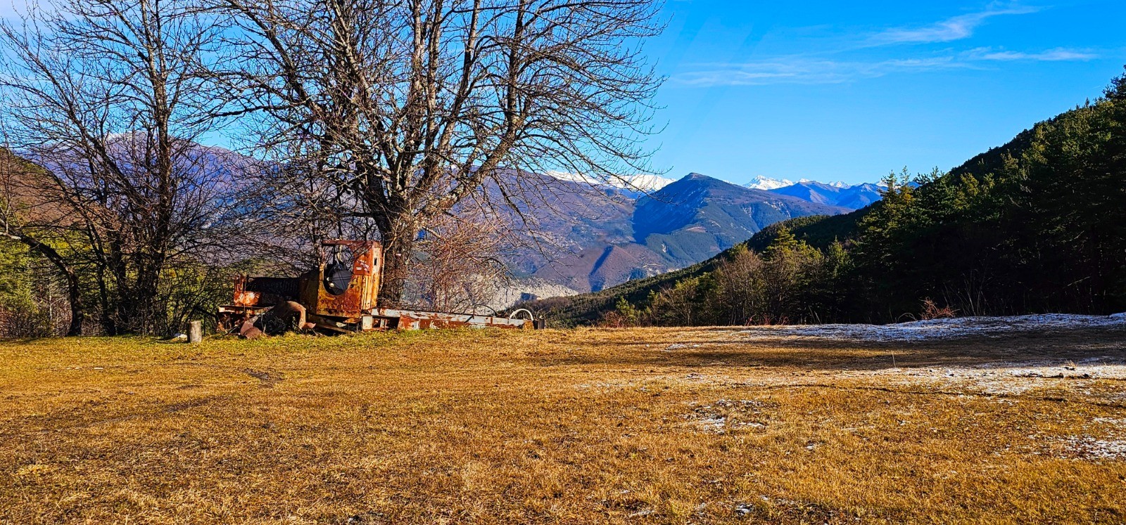 Epave "camionnette Dodge" avec massif enneigé du Mercantour en arrière-plan. Emprunt du GR 4 depuis ce point.