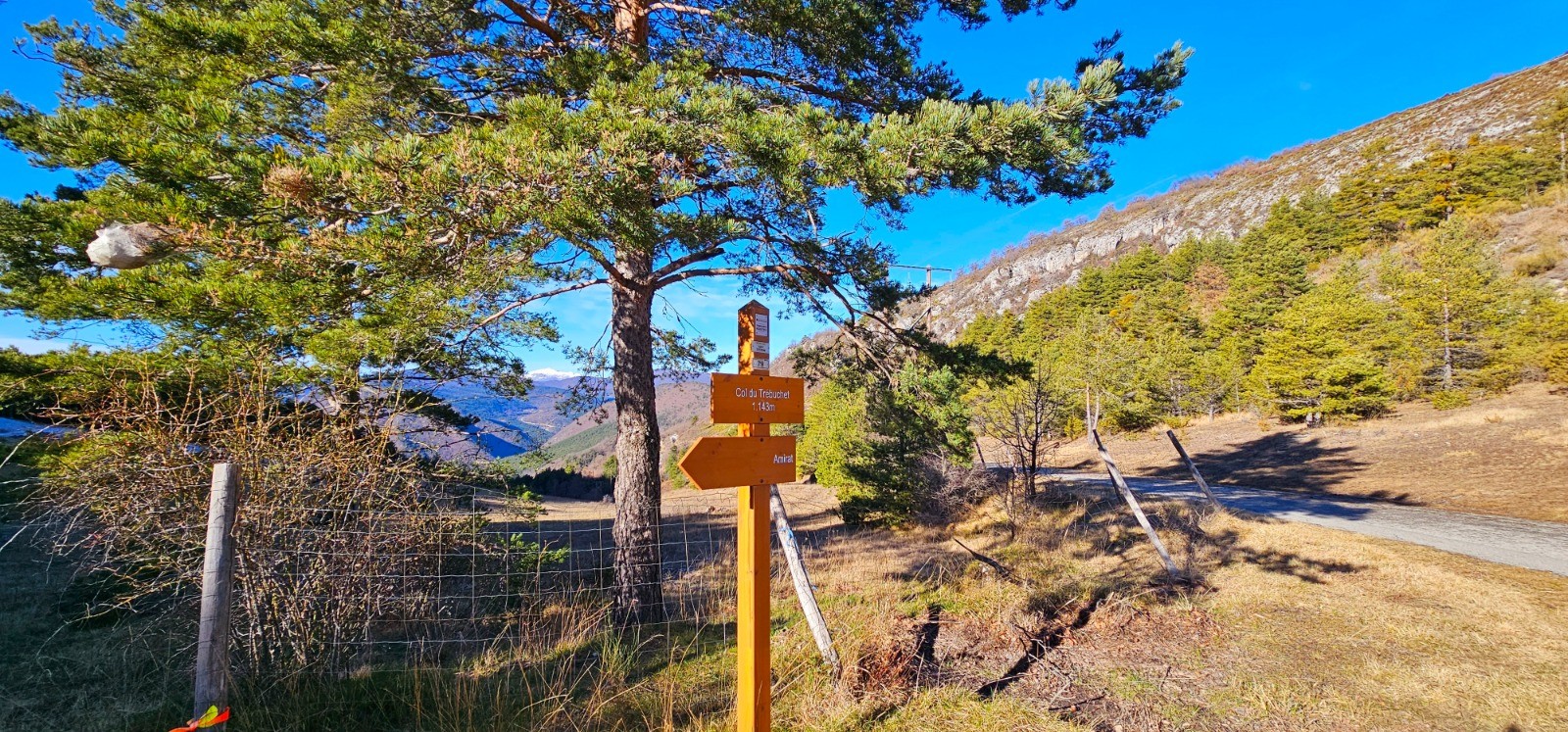 En ascension constante jusqu'au col d'Avenos avant descente au col du Trébuchet (1143 m) qui marque la limite territoriale avec les Alpes de Haute Provence. Départ depuis la place centrale du village d'Amirat à l'extrémité de la rue de la Brasche comprenant vaste parking avec vue panoramique sur vallée en contrebas. Autres emplacements de stationnement à hauteur de la balise 51 après l'église Sainte-Anne précédant le village.