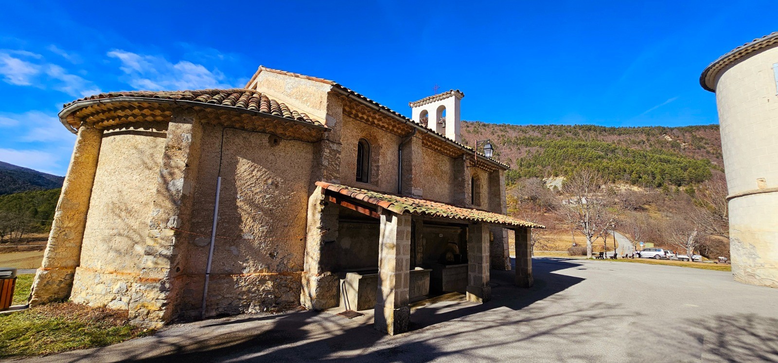 Approvisionnement en eau assuré par fontaine lavoir sur face Est de la chapelle.