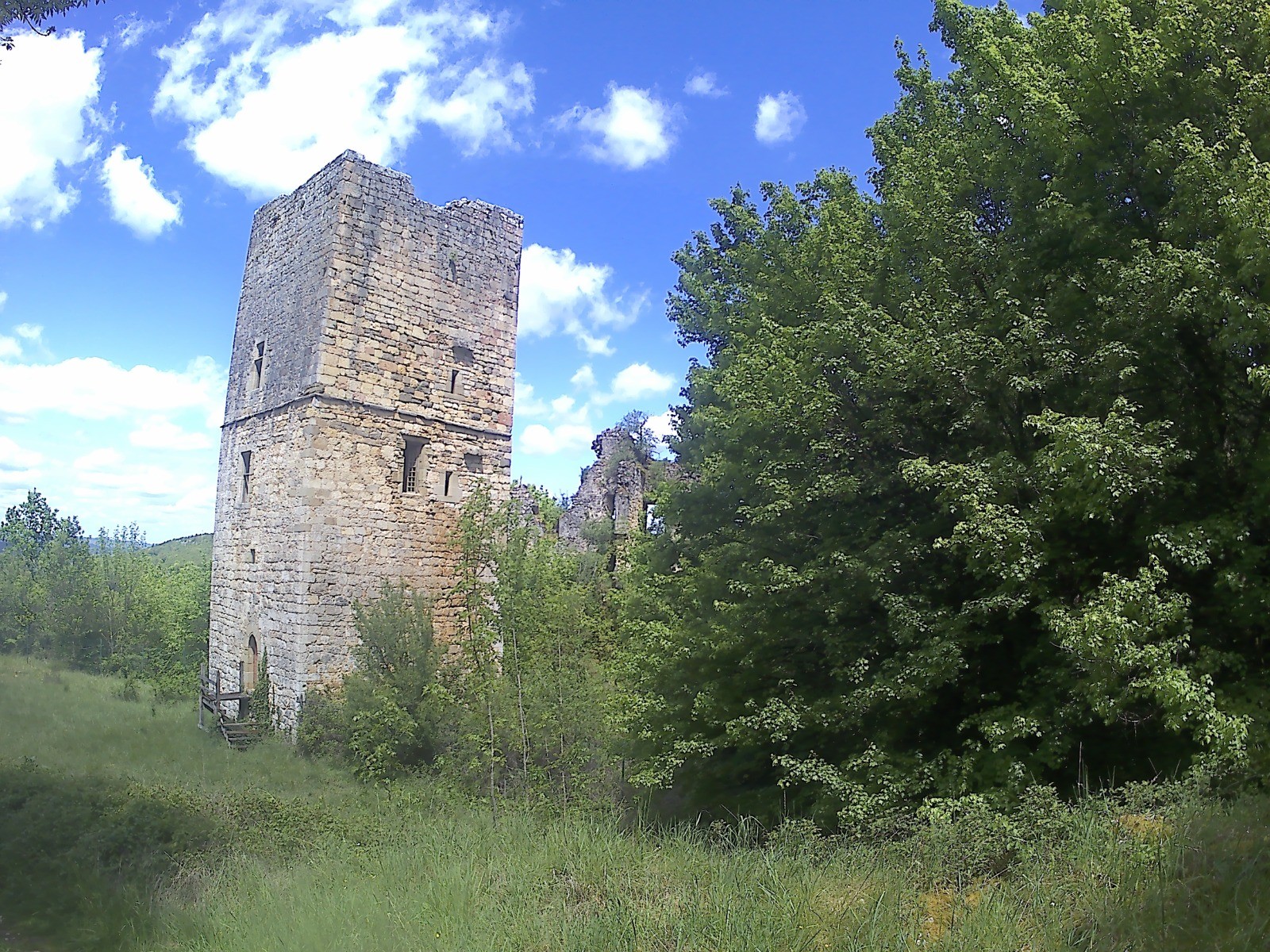 A Couzage, devant la maison un chemin permet de s'approcher de la tour. Face à la maison prendre le chemin qui monte et passe devant une antenne puis entre des rochers. Sur le haut à gauche détour vers un point de vue sur le lac du Causse.