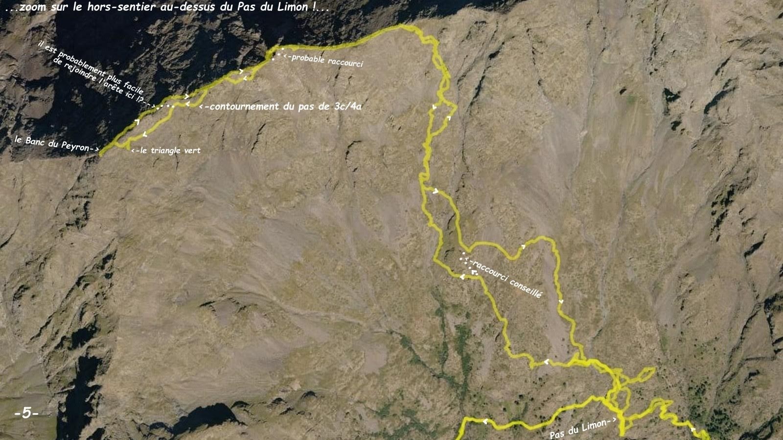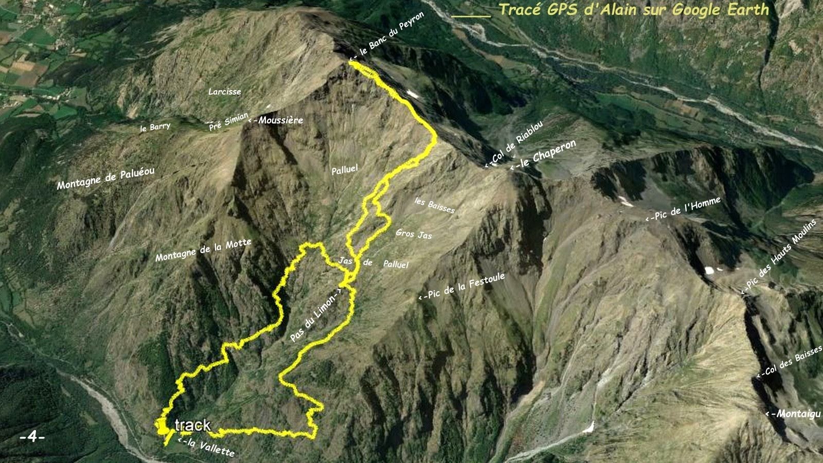 Après avoir franchi le pont de bois sur le Torrent de la Vallette, prendre sur moins de 200 m la première piste agricole sur la gauche, petit parking au bout en face de l'entrée d'un champ, juste au départ du sentier du Pas du Limon le plus à l'Est, un peu difficile à suivre jusqu'à ses premiers lacets au Nord-Ouest de la grange au-dessus des champs. Le suivre sans difficulté, sinon la rudesse du relief, jusqu'au pas du Limon > hors-sentier, Jas de Palluel en traversée vers l'Ouest pour franchir la croupe Sud de la cote 2648 m vers 2150 m > la remonter sur 50 m avant une traversée ascendante jusqu'à passer en rive droite du thalweg qu'on remonte au mieux jusqu'à la crête, 2570 m > franchir la première bosse de l'arête par le fil, excellent rocher > pour la suivante, nous avons préféré le petit couloir cheminée du versant Nord > court-circuit de la suivante par son versant Sud > ainsi que tout le reste de l'arête en suivant au début de gros cairns > puis tout un système de vires à chamois ascendantes faciles jusqu'à la petite terrasse bien verte très caractéristique sur l'éperon Sud-Est, environ 50 m sous l'arête au plus près du sommet qu'on rejoint en escaladant un petit couloir cheminée d'une dizaine de m sur la droite (solution d'évitement de la partie la plus délicate de l'arête Est pour les moins aguerris ! Mais bien moins ludique et esthétique !) > retour par le fil de l'arête avec l'usage de la corde pour notre sécurité, un pas de 3c / 4a ? très aérien, puis par l'itinéraire de montée jusqu'à la cote 2300 m, à partir de laquelle une confortable vire à chamois permet de rejoindre plus facilement les Baisses en franchissant la croupe vers 2250 m > le Pas du Limon au mieux par l'alpage du Gros Jas > retour par le sentier Ouest et la rive droite du Torrent de la Vallette.