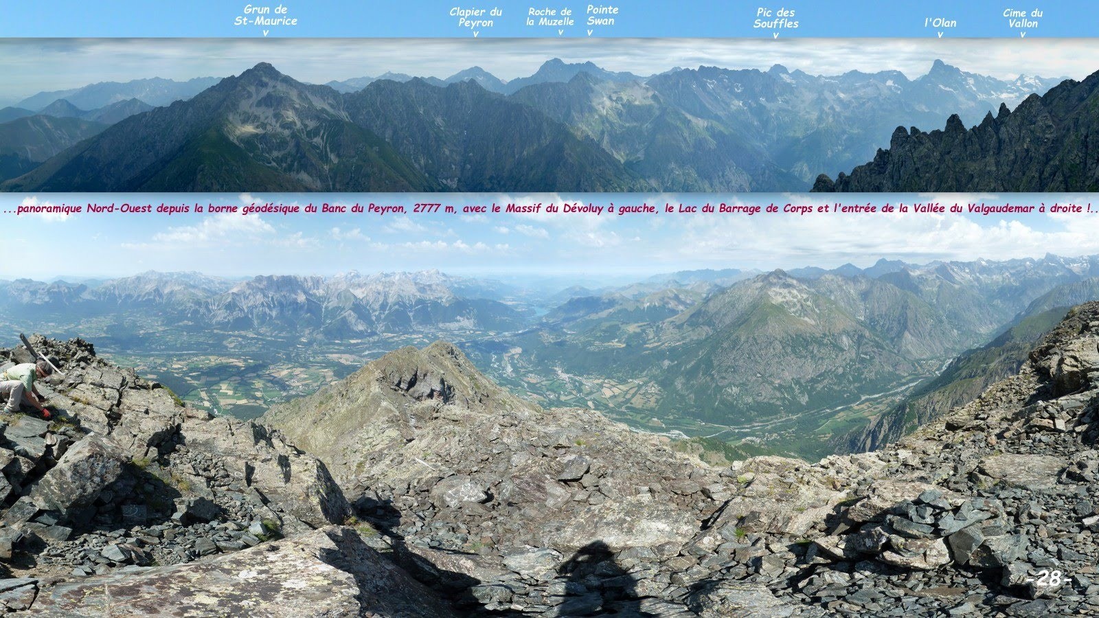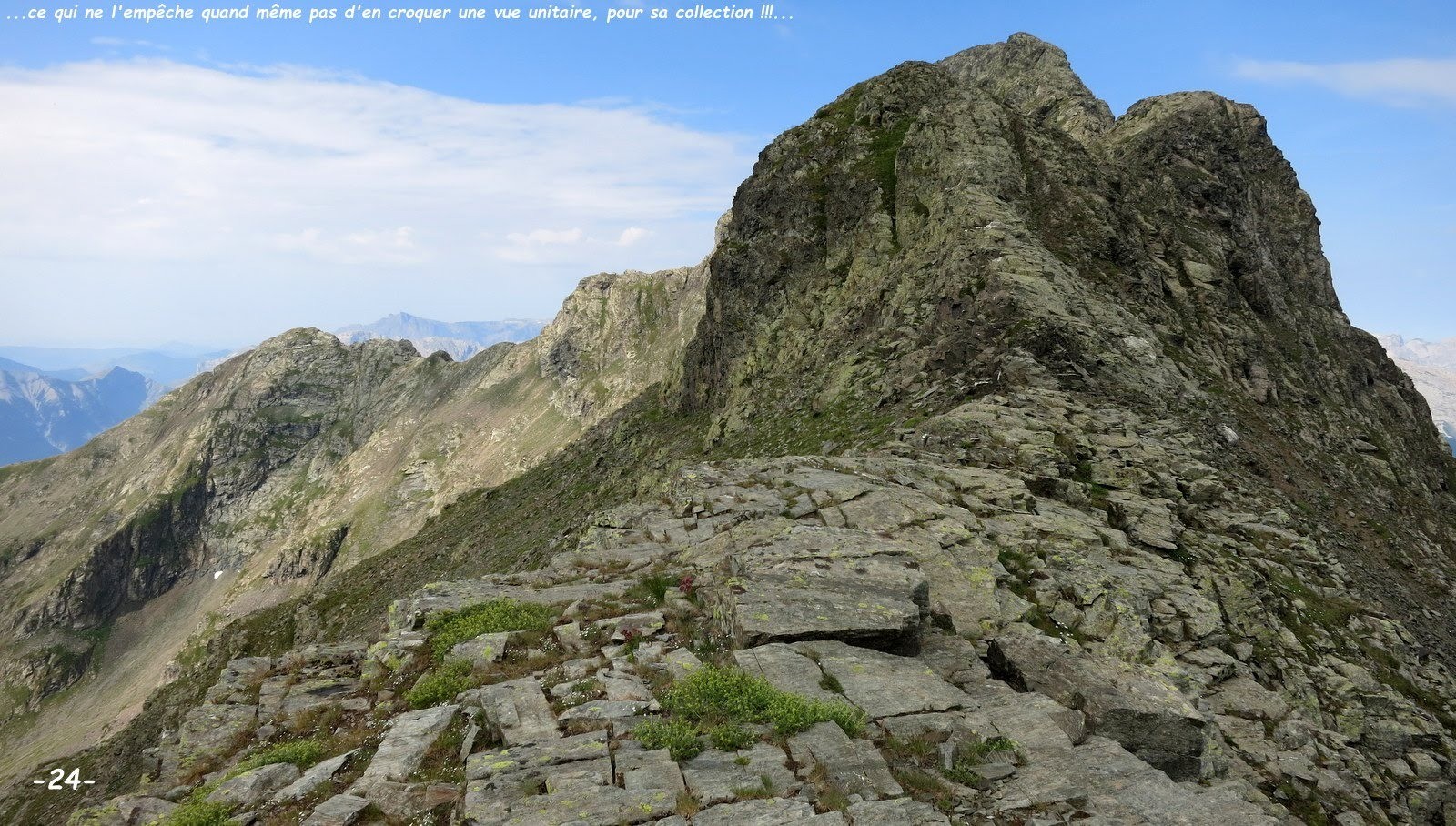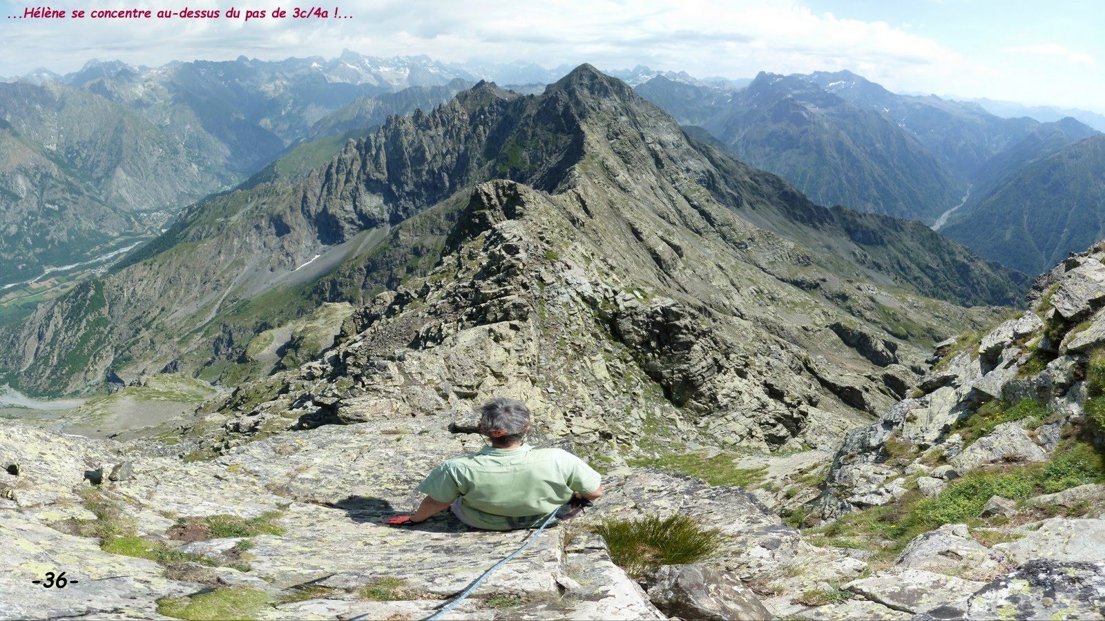 les esprits critiques ne manqueront pas, à juste titre, de s'étonner « qu'est ce que c'est que ce charlot qui évite les principales difficultés à la montée pour ensuite les franchir à la descente ? ». Alors, sachez que mon principal objectif était d'accompagner mon amie Hélène, randonneuse experte, mais sans la moindre notion d'escalade et à fortiori d'alpinisme, native du Champsaur, au sommet de cette montagne emblématique guère parcourue que par les chasseurs de chamois avant la création du Parc des Écrins et dont elle a tant entendu parler. Très impressionnée par la topologie de cette arête aux versants vertigineux, afin de pas me heurter à un refus catégorique d'en franchir le principal obstacle, dès sa base, j'ai choisi de suivre les gros cairns de son contournement versant Sud, puis voyant la succession de vires à chamois ascendantes relativement confortables qui font suite, je n'ai pas vu et donc négligé l'option de rattrapage de l'arête de suite après, et comme la remontée d'un petit couloir cheminée même raide ne l'impressionne pas, nous y sommes arrivés sans aucun souci. La joie d'y être parvenus et l'impérieuse nécessité de devoir redescendre aidant, bien rassurée et assurée par la corde, pour le plaisir et l'esthétique nous sommes descendus, très lentement et très prudemment par le fil de l'arête, toujours en excellent rocher, le pas de 3c, voire 4a, est certes « hard » mais facile à sécuriser dès qu'on a un peu d'expérience alpine.
