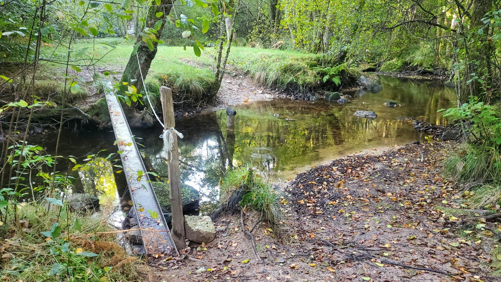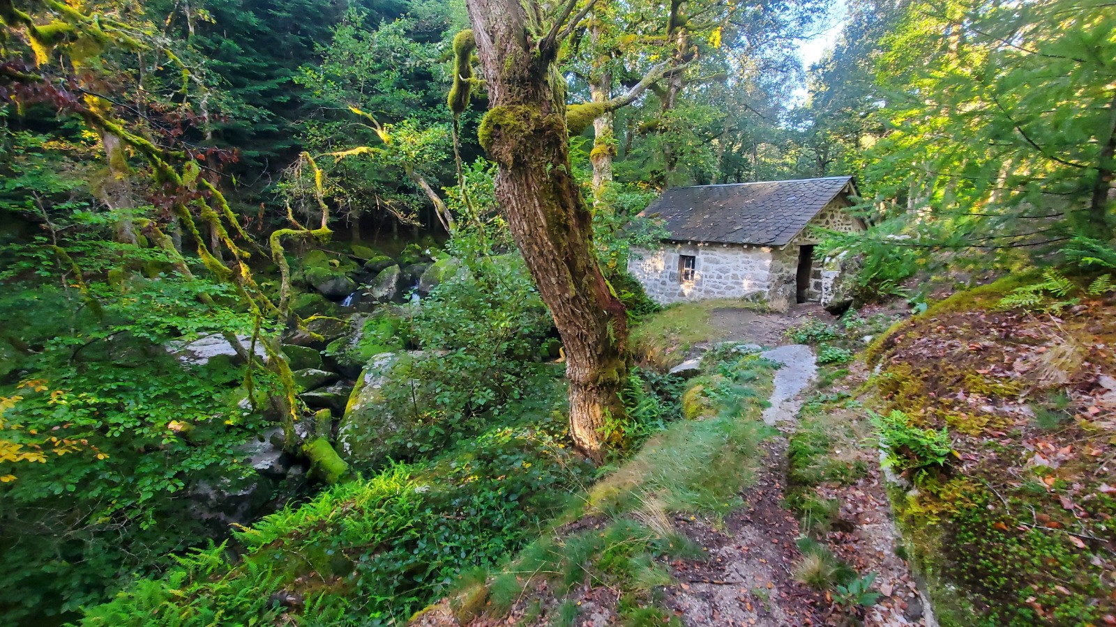 au PK 6.50 prendre à droite la piste qui descend vers la rivière. Celle ci sera franchie soit à gué soit sur la poutrelle (voir photo). Un peu plus loin, un petit détour - personnellement je l'ai fait à pied - vers le moulin qui domine les cascades du Deiro (photo).