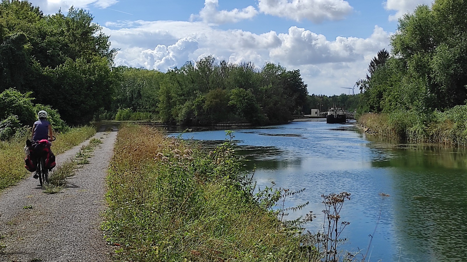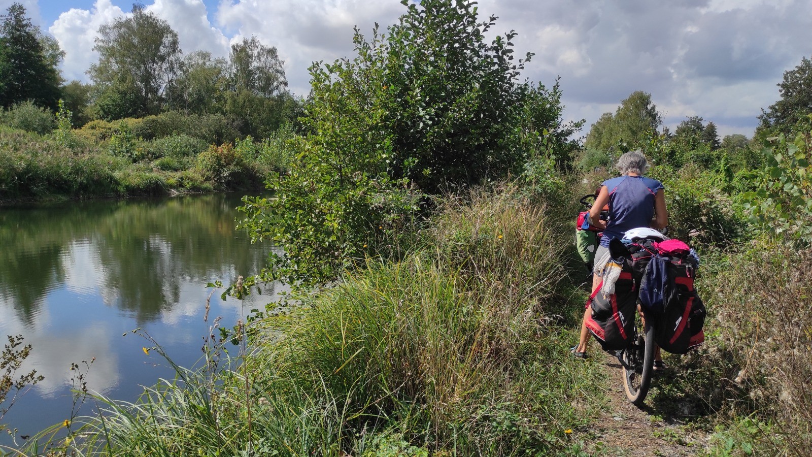 Étape du jour visée : Péronne pour y rester un jour. Distance : 60 km. On en fera plus sans atteindre Péronne. Un mauvais choix avant Ham où l'on à pris une piste de plus en plus impraticable, entre deux cours d'eau, plein d'orties puis avec des infrans. Demis tour au bout de 2 km.