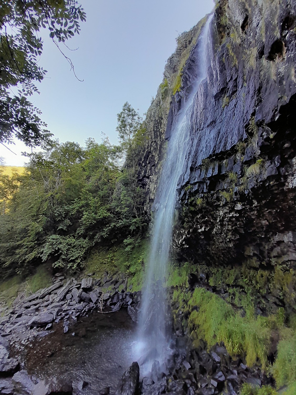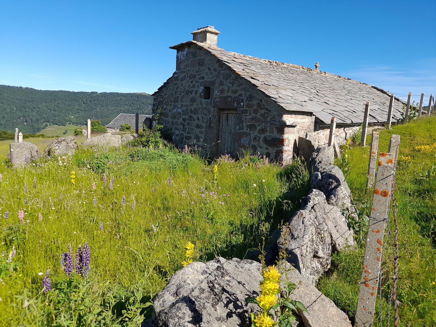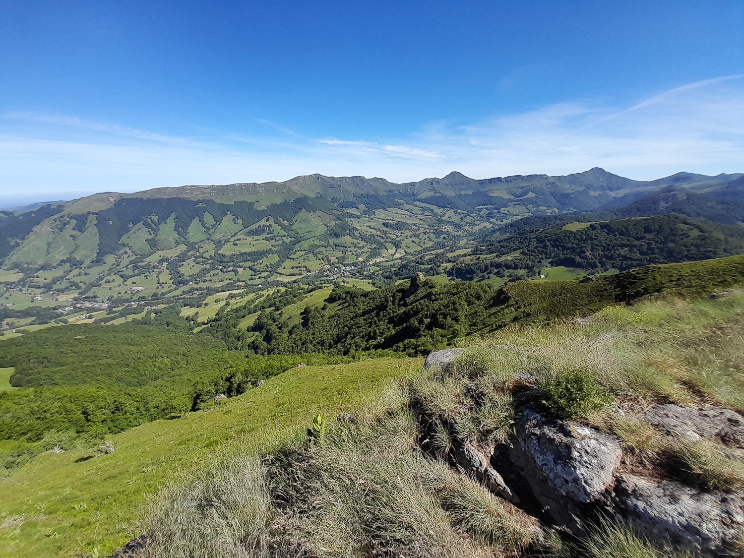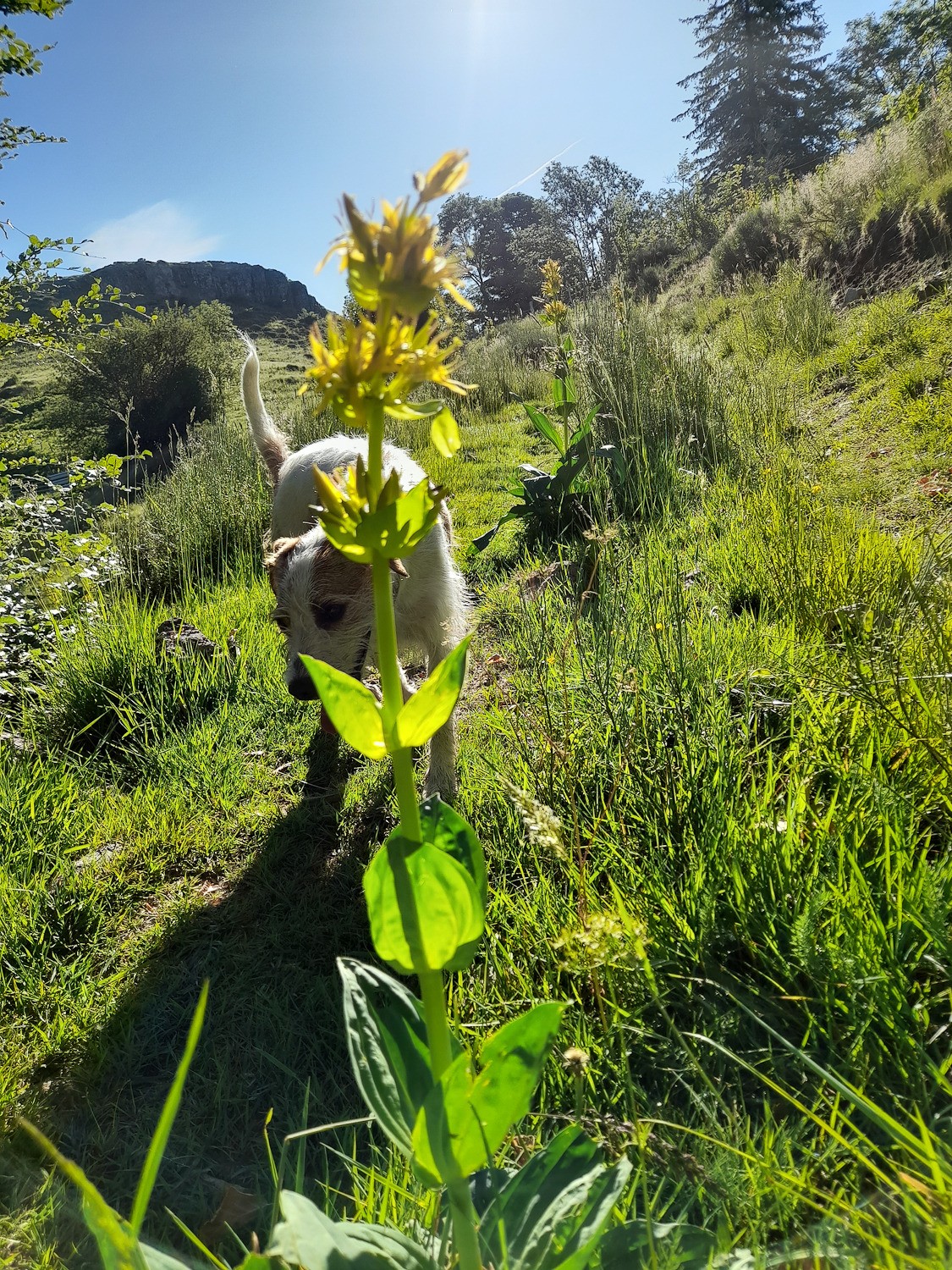 Bonjour, ai privilégié le départ à deux pas de la cascade. Ensuite on est allés sur les hauteurs vers les panoramas. Une photo de gentiane à laquelle Mlle à tenu à participer et direction le Buron. Ce dernier n'est pas visitable à l'intérieur, dommage. En suivant quelques belles vues sur les monts environnants, pour arriver au point culminant: Elancèze. Là encore Sally à tenu à faire la star. Descente vers le pas de Mandailles et le Roc du Chauve. Un crochet vers le Courpou sauvage et, plus de chemin. Donc adaptation au travers des bois pour retrouver la trace un peu plus bas. Arrivés à la voiture, une pose au pied d'un copain très affectueux, aux grandes oreilles ce qui n'était pas au goût de tous.