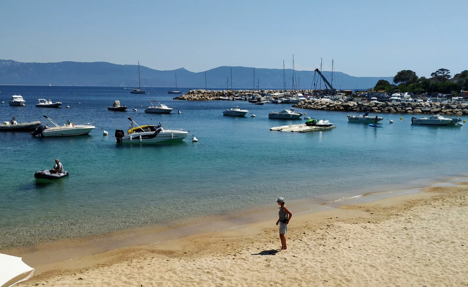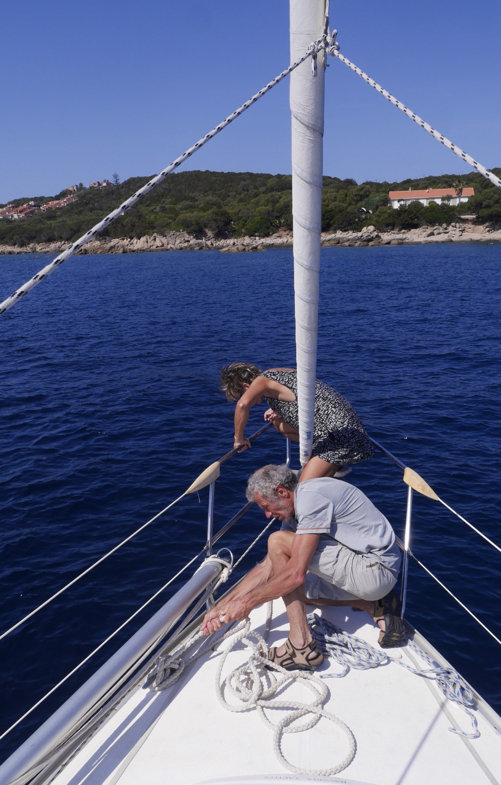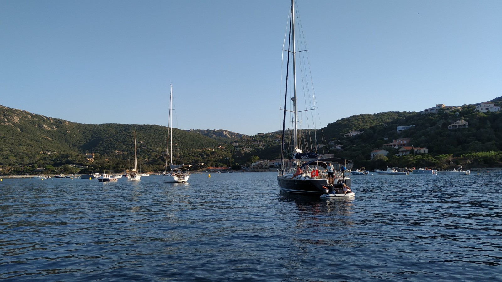 Nous traversons la baie à la voile pour aller mouiller à Campomoro. Baignade jusqu'aux rochers, commérages.