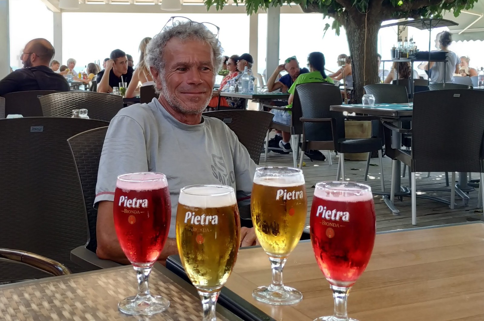 Porto Pollo vers 11hrs. On prend coffre devant le petit port, puis opération poubelles, ravitaillement, en annexe. Pendant que le poissonnier nous prépare les dorades, nous allons prendre un pot au troquet d'en face. On y restera manger finalement.