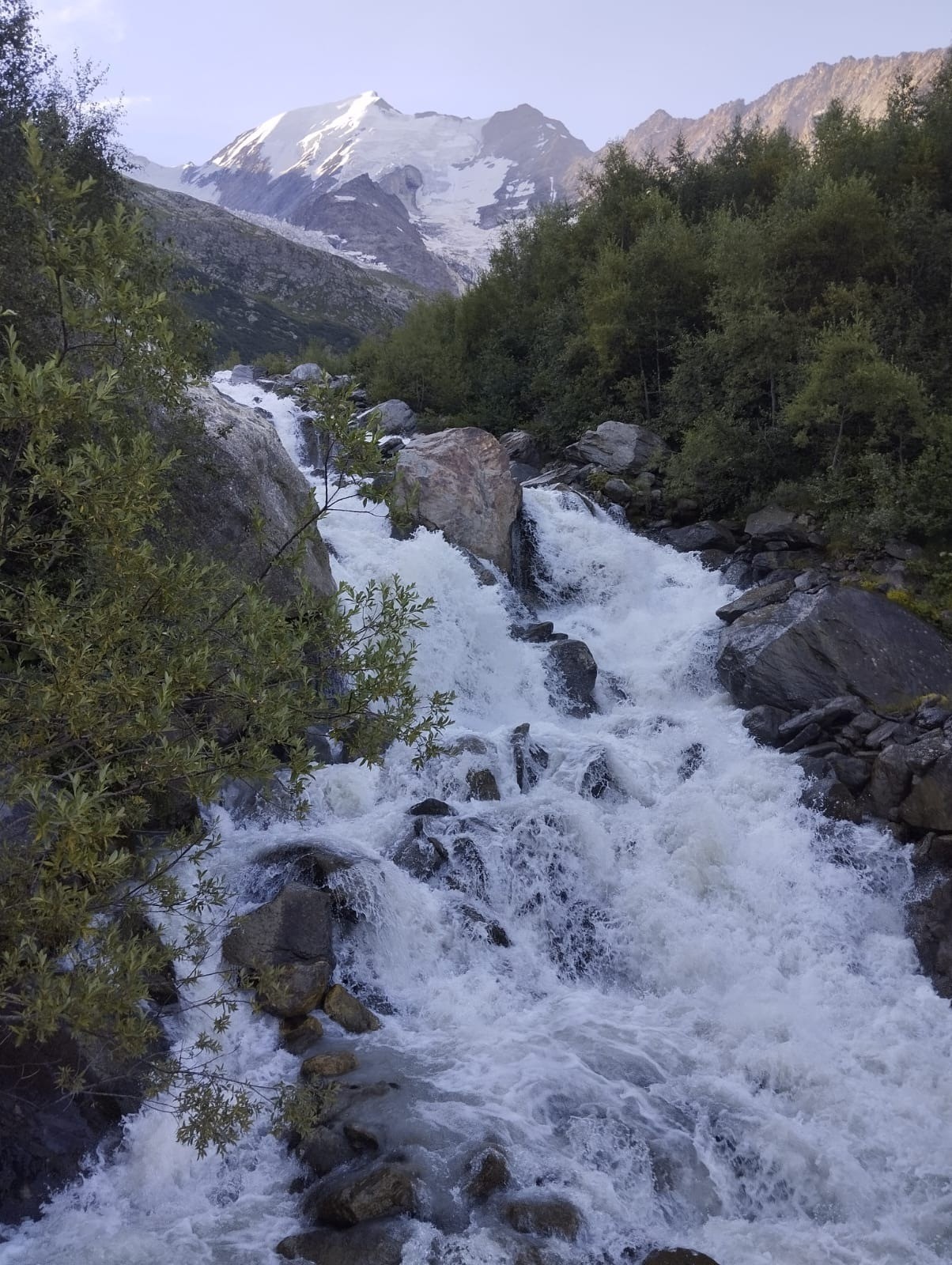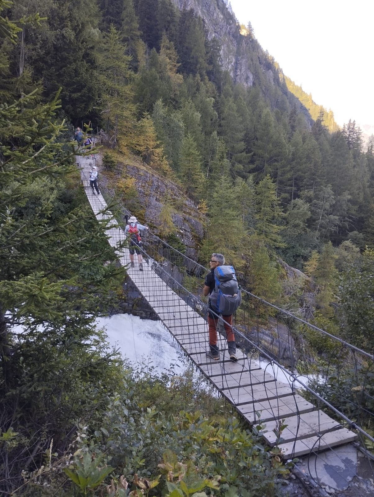 Depuis ce superbe refuge du Fioux, nous avons emprunté une variante du TMB ce qui nous a permis de traverser le torrent du Glacier de Bionnassay sur une passerelle de type "pont de singe" (ça balance un peu, mais sans aucun danger).