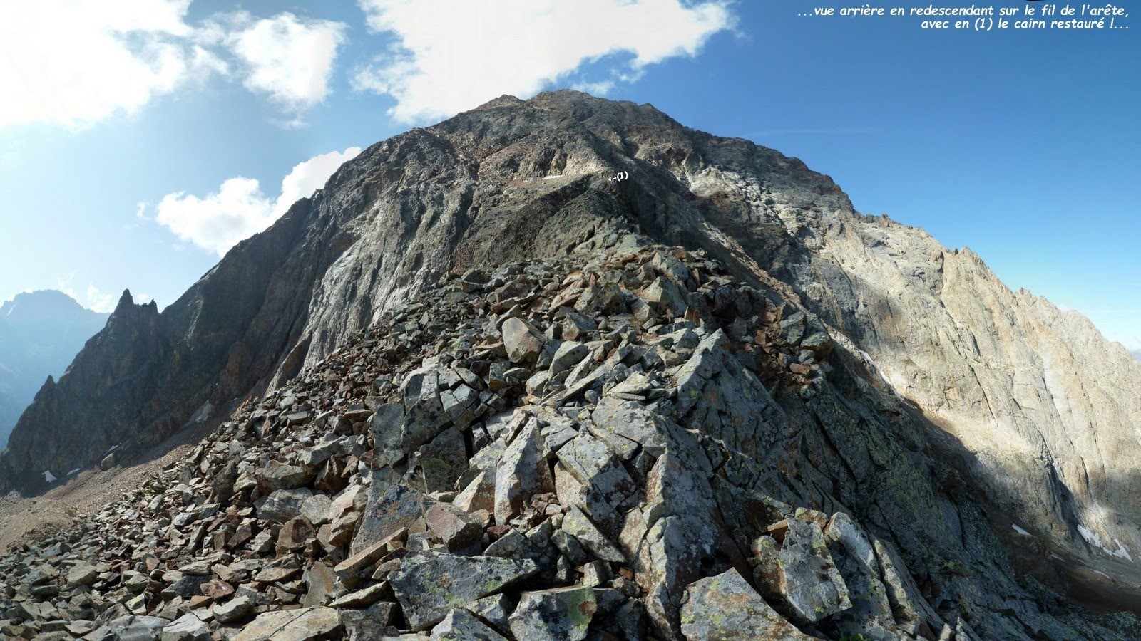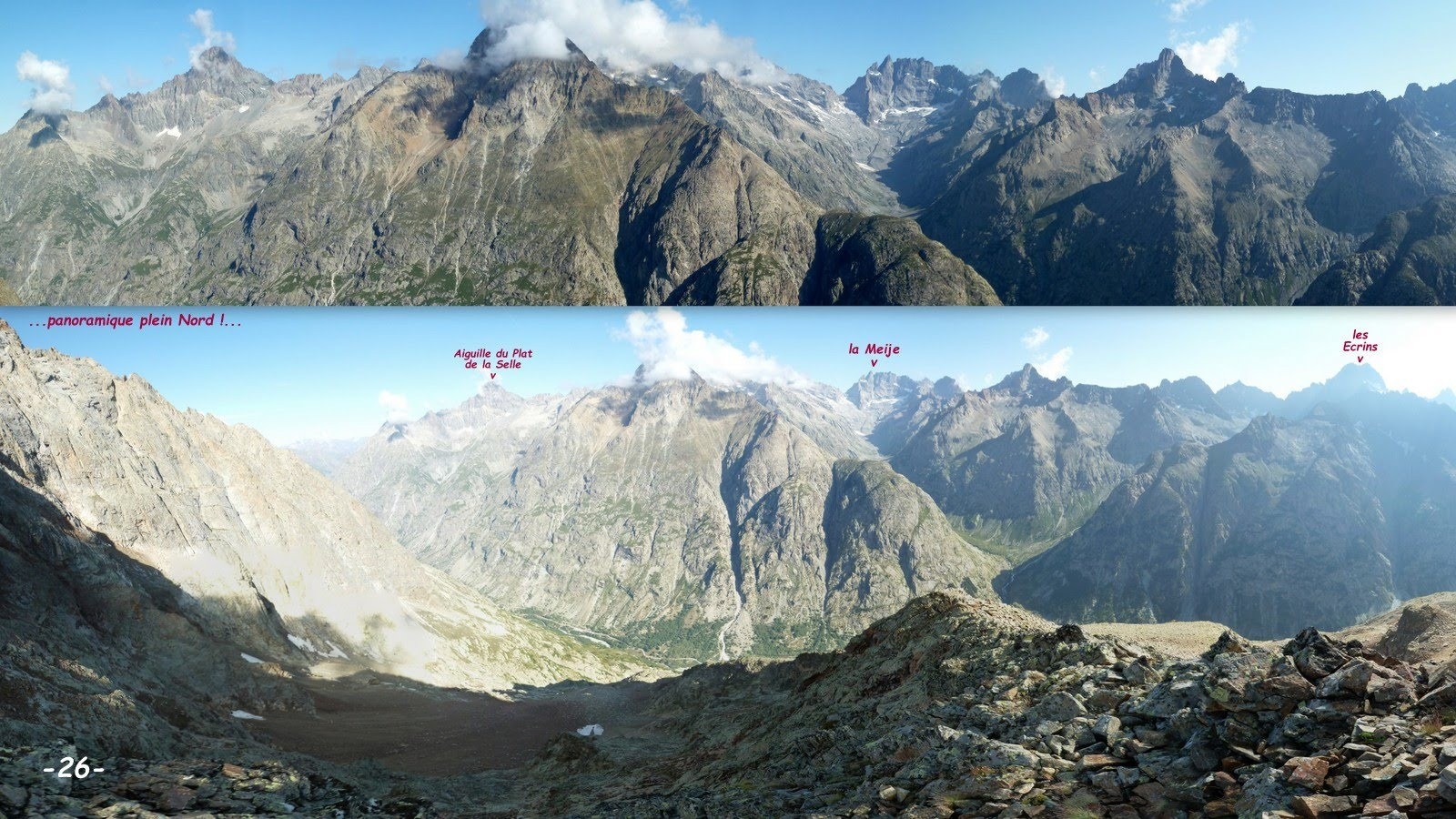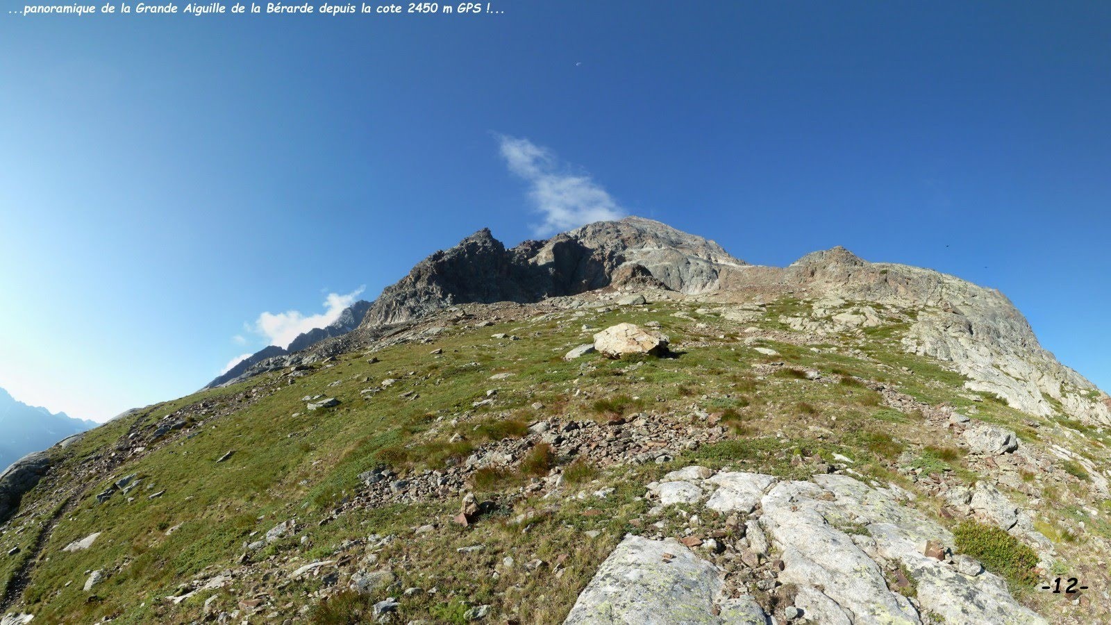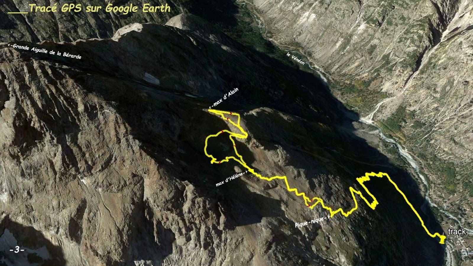 En fait le sentier répertorié sur l'IGN se poursuit en amont de la cote 2529 m, sur l'ancienne moraine qu'il remonte péniblement jusqu'au pied de la bosse rocheuse cotée 2683 m, où l'on trouve un bon emplacement de bivouac bien aménagé. De là, par une ligne de cairns en traversée ascendante dans le pierrier de droite jusqu'à une sente qui rallie le collet morainique sous l'arête nord-nord-est de la Grande Aiguille de la Bérarde, tandis que la ligne de cairns monte au ras des rochers jusqu'au sommet de la bosse rocheuse précédemment citée 2683 m, qui domine le lieu de bivouac et trône au milieu de l'ex-cirque glaciaire de la Grande Aiguille de la Bérarde, solution que j'ai adoptée pour le spectacle ! Ensuite j'ai franchi la moraine et suis descendu pour prendre pied sur le névé qui occupe encore le fond de la combe, que j'ai traversée quasiment à niveau pour revenir sur la VN de la Grande Aiguille par son arête nord-nord-est que j'ai suivie jusqu'à sa première antécime, ornée d'un gros cairn, à l'altitude GPS de 2820 m. S'il ne s'était pas agi d'une journée de semi-repos et si je n'avais pas craint que ma coéquipière restée au bivouac ne s'inquiète trop, j'aurais bien effectué l'aller-retour au sommet ! Mais la raison l'ayant emportée, après la surélévation du cairn, je suis redescendu en, toujours pour le spectacle, restant le plus longtemps possible sur le fil de l'arête jusqu'à l'impressionnante verticale de la Bérarde, fortes sensations garanties! avant de traverser au mieux la base de ce triangle suspendu pour revenir sur la VN, cette fois suivie jusqu'au bivouac. Retour par l'itinéraire de montée car, à moins de jouer les funambules, il n'y a pas, à ma connaissance, d'autre possibilité !