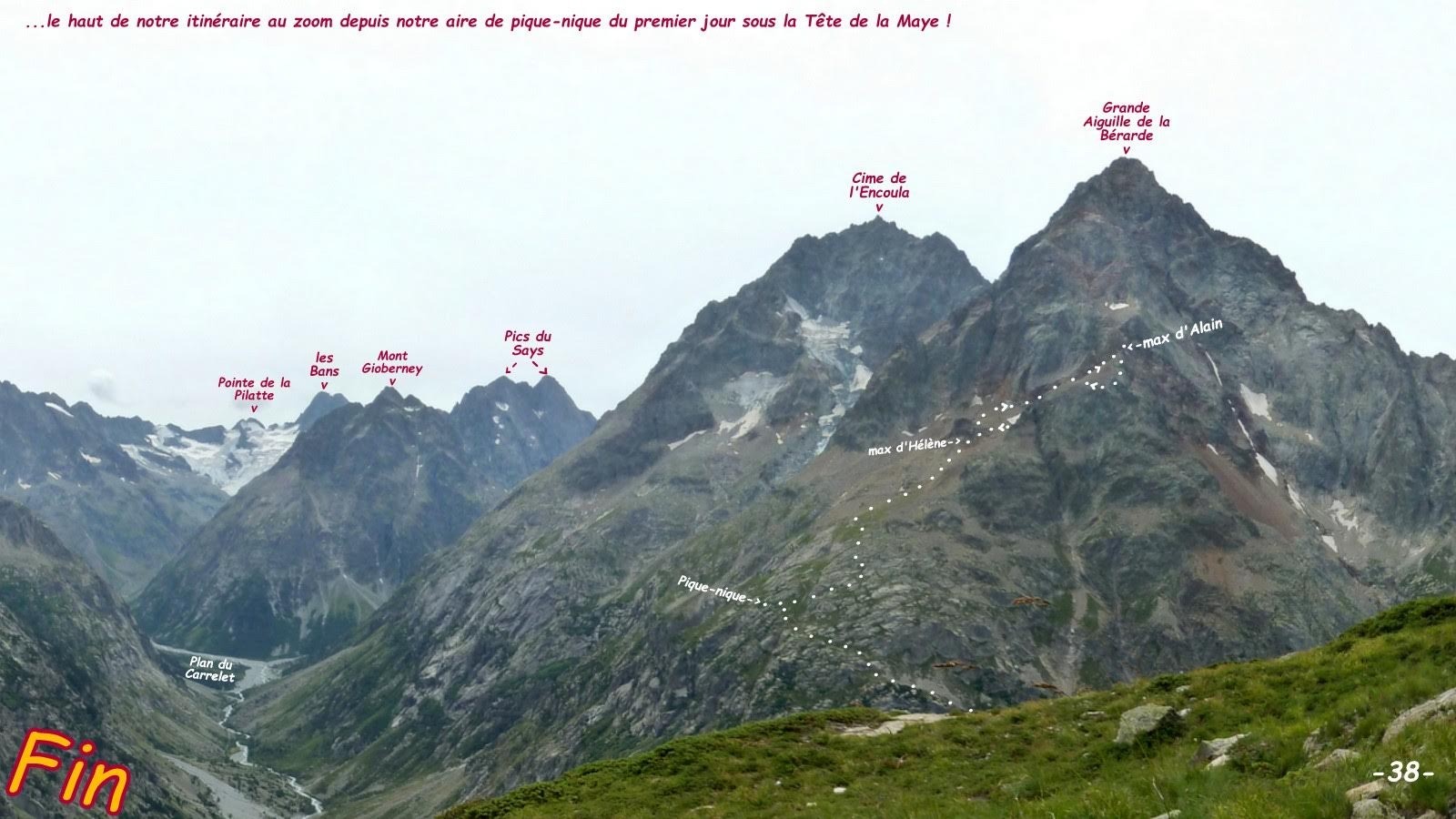 En guise de repos actif entre deux grosses randonnées, nous avons voulu voir de plus près à quoi ressemblait le spectaculaire sentier dit du dessous de la Grande Aiguille de la Bérarde, bien visible depuis la Tête de la Maye. Eh bien nous n'avons vraiment pas été déçus ! Certes il n'y a aucun passage câblé contrairement à celui de la Tête de la Maye et il ne faut véritablement s'aider des mains qu'à seulement deux reprises pour de courts passages rocheux dont le plus haut ne dépasse pas les 4 m. Spectaculaire sentier, très étroit, aux lacets très courts et raides sur une forte pente herbeuse puis dans une incroyable traversée de barres rocheuses parmi des vernes et c'est heureux, sinon, je ne vous dis pas le côté vertigineux, tout particulièrement à la descente ! Au-dessus des barres, il devient plus normal jusqu'à son terminus sur l'IGN à la cote 2529 m.