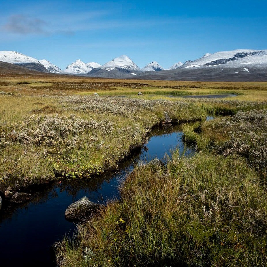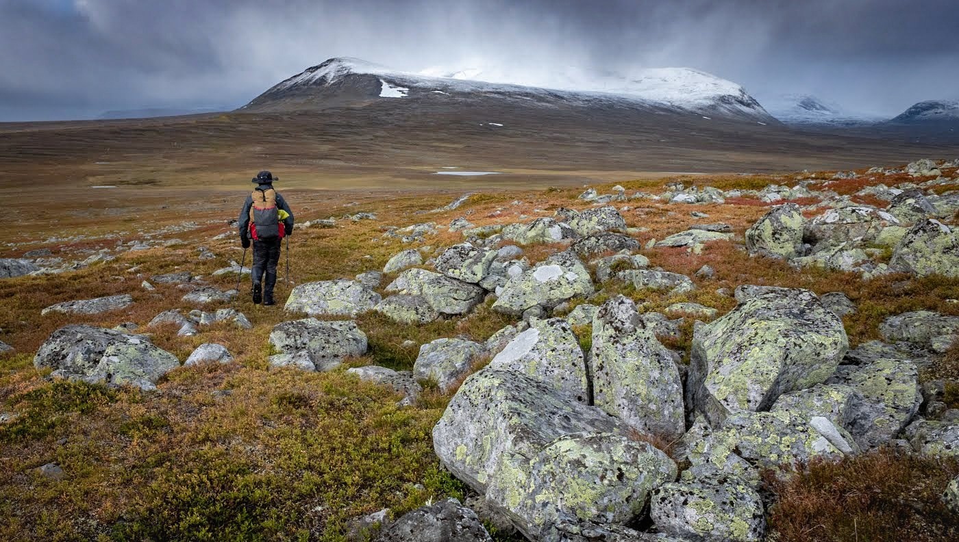 Suède. Réalisé du 2 au 12 septembre 2019. Tracé empruntant en grande partie le Kungsleden. Le double crochet vers le nord-ouest : d'abord un bivouac suivi d'un retour pour s'abriter au refuge, puis un aller-retour pour marcher jusqu'au glacier de Bårdde à travers un superbe paysage de toundra.