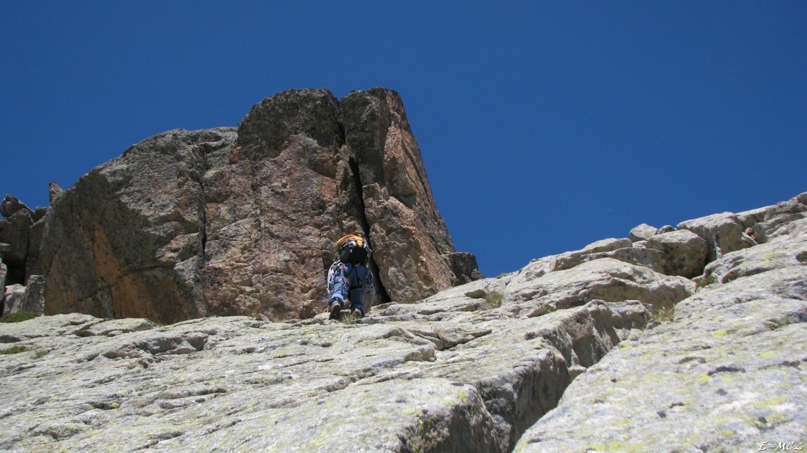 Remonter ce vallon jusqu’à la brèche de la Lie par son thalweg en cheminant au mieux entre d’énormes blocs de granite. En arrivant sur la brèche partir sur la droite en contrebas de l’arête et utiliser un couloir redressé pour accéder à la crête surmontée d’un énorme monolithe. Grimper sur la droite un ressaut d’une dizaine de mètres, quelques pas de III et suivre les cairns jusqu’au sommet du Pic de la Lie. A mi-hauteur il y a un autre passage à grimper de même difficulté. Le reste de la montée est facile. Revenir à brèche de la Lie, continuer vers le Pic de Batbielh aussi appelé Pic de Batboucou, quand l’arête se redresse basculer versant sud et monter par une sorte de corniche vers la grande dalle blanche, à l’aplomb du sommet, surmontée d'un gros bloc de couleur rouille. Escalader cette dalle sur sa partie droite dans une fissure facile, quelques pas de III avant d’arriver au sommet.