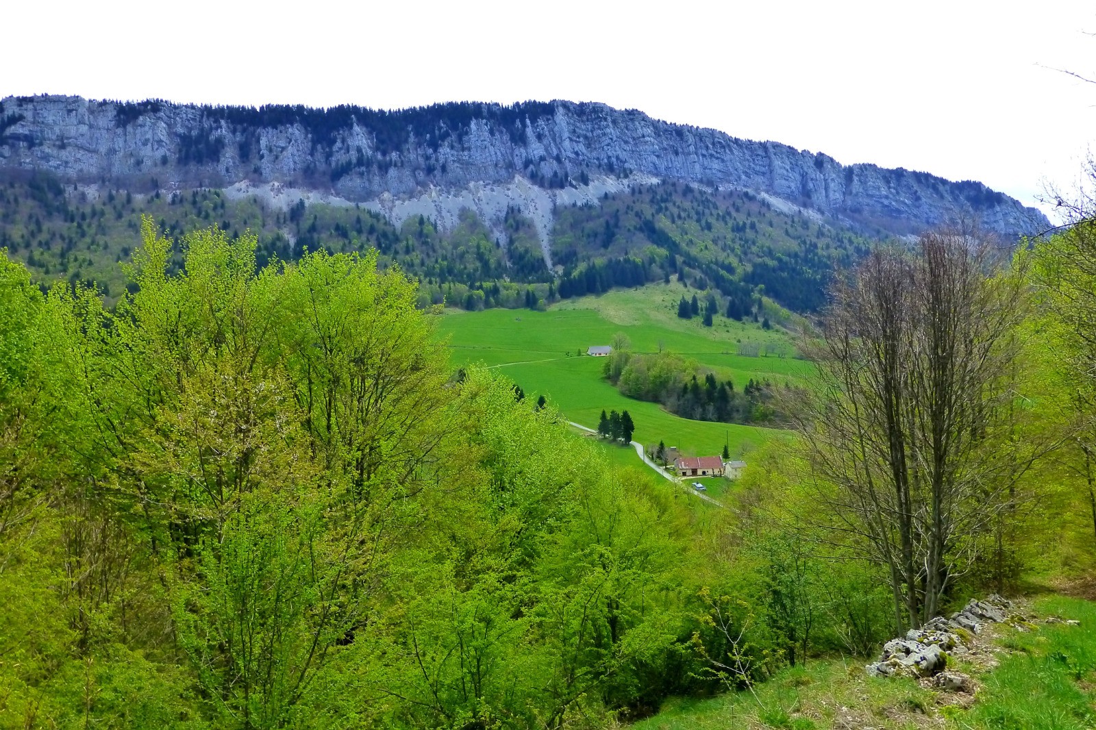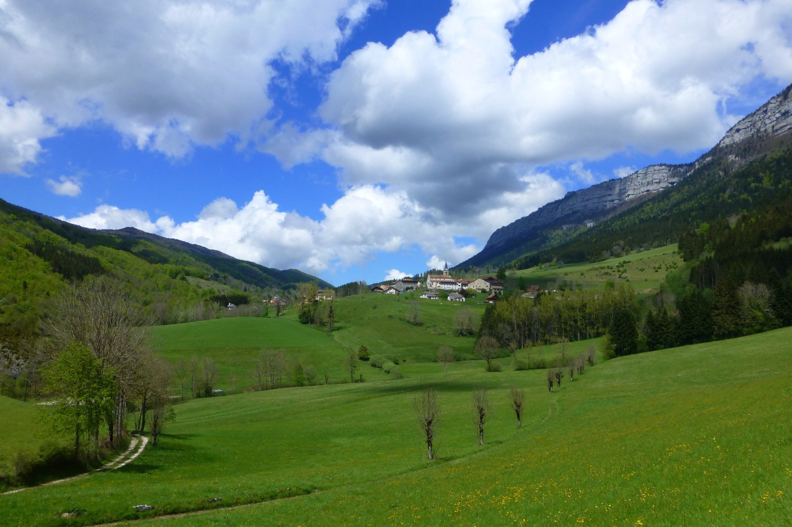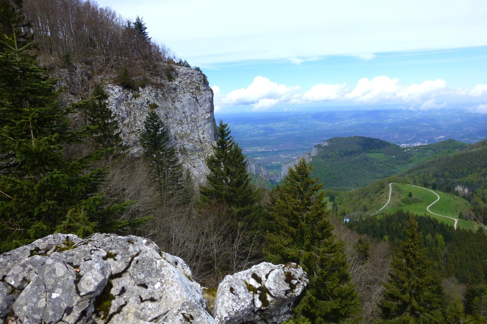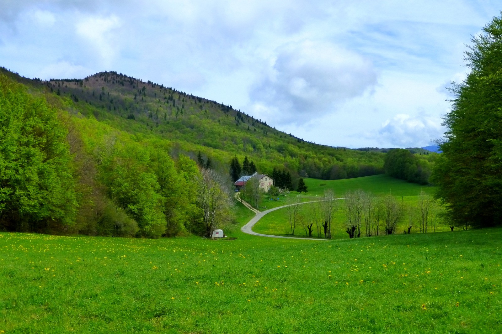 Randonnée "verte" (prairies, forêts) entre Rencurel et le col de Romeyère. Au pas du Follet, une très belle vue sur le cirque de Malleval.