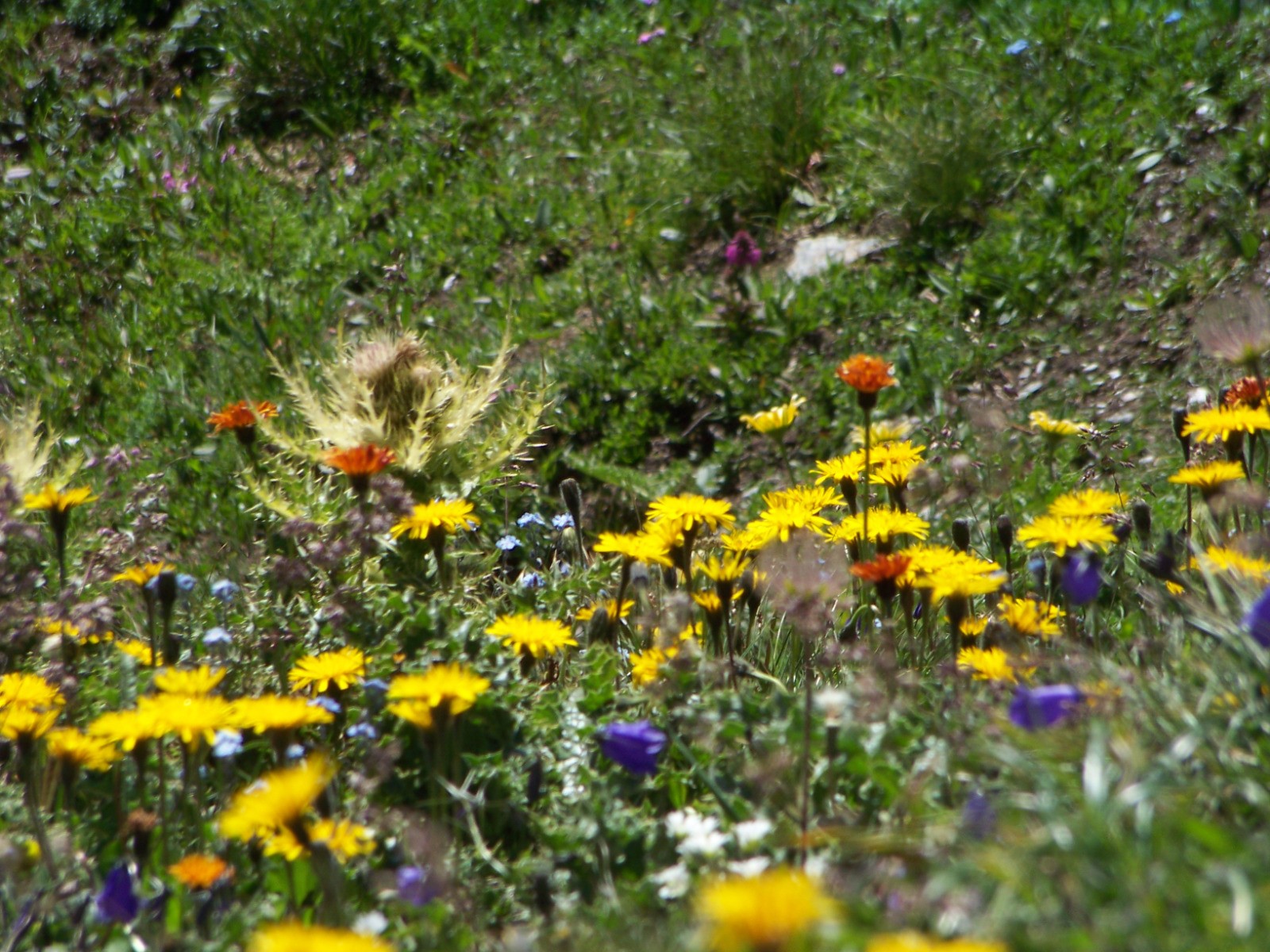 Retour sur le versant E du col du Mont Cenis par en sentier ultra marqué, raide. Les deux passages câblés peuvent aider...Ça glisse bien quand c'est mouillé. Mais c'est très chouette dans de vastes alpages fleuris!
