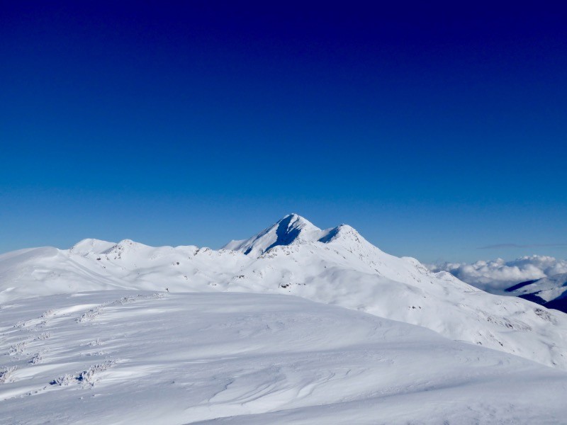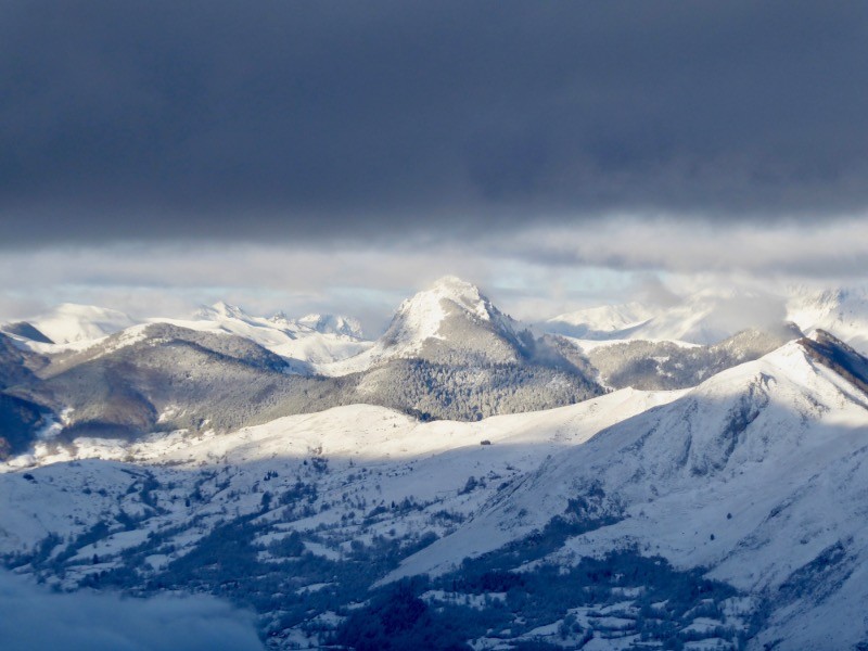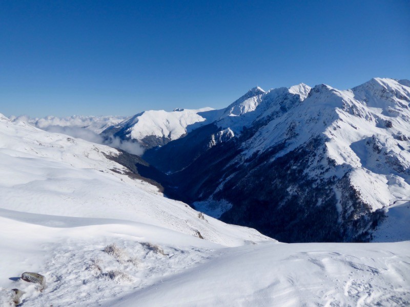 Superbe panorama sur les sommet environnants du Pic du Midi de Bigorre ,au Montaigu ,au Pic de Léviste , Soum de Lascours, Soum Arrouy et Pène Louque et le lac d'Ours avec au dessus le Col de Bareilles sous le Pic de Bizourtère . Et derrière nous le Pic de Bazès la crête de Couraduque, le Pic du Midi d'Arrens.....