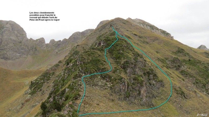 Du Capet suivre facilement la crête vers le nord jusqu'au col 2297 m. On est face à un ressaut assez raide. Deux possibilités pour le franchir : monter directement, traces de passages dans un terrain peu agréables mais qui reste assez facile à négocier ou contourner le ressaut par la droite en revenant dès que c'est possible sur l'arête, terrain aussi peu agréable mais plus rassurant. Le contournement a été emprunté le week end suivant pour une autre randonnée remontant la même arête du Pène det Pouri.