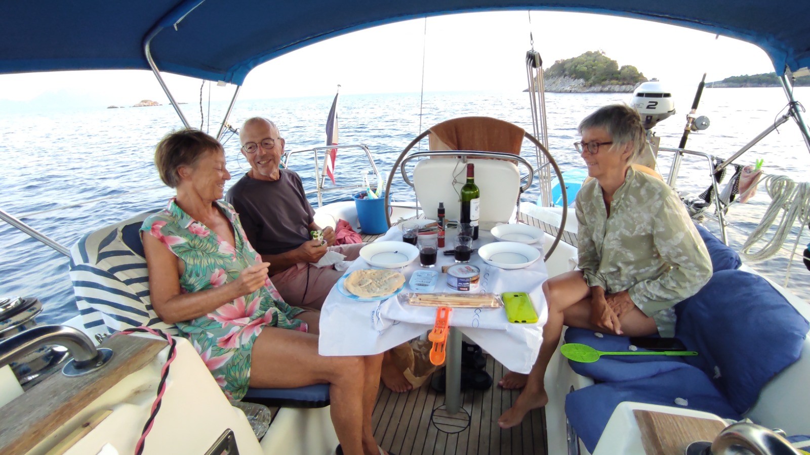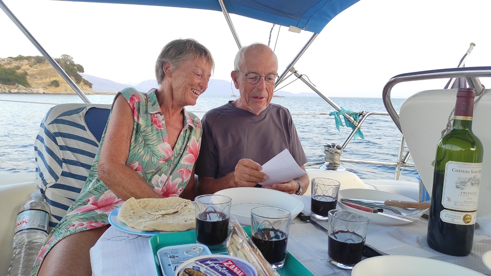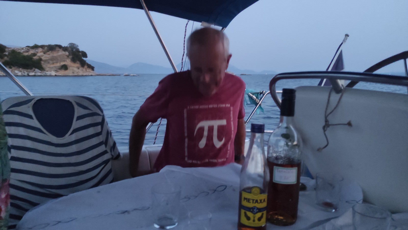 Journée tranquille, nous ne ferons qu'un aller-retour à Palairos au moteur. Un journée encore très chaude. On fait les courses classiques, eau, fruits...et taverne pour un giros pitas.